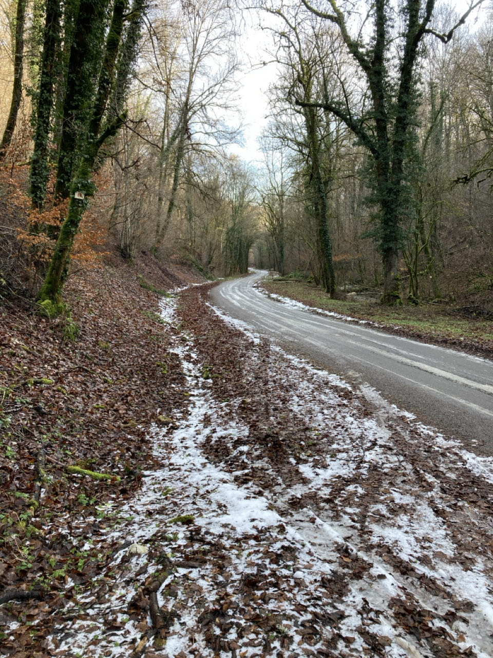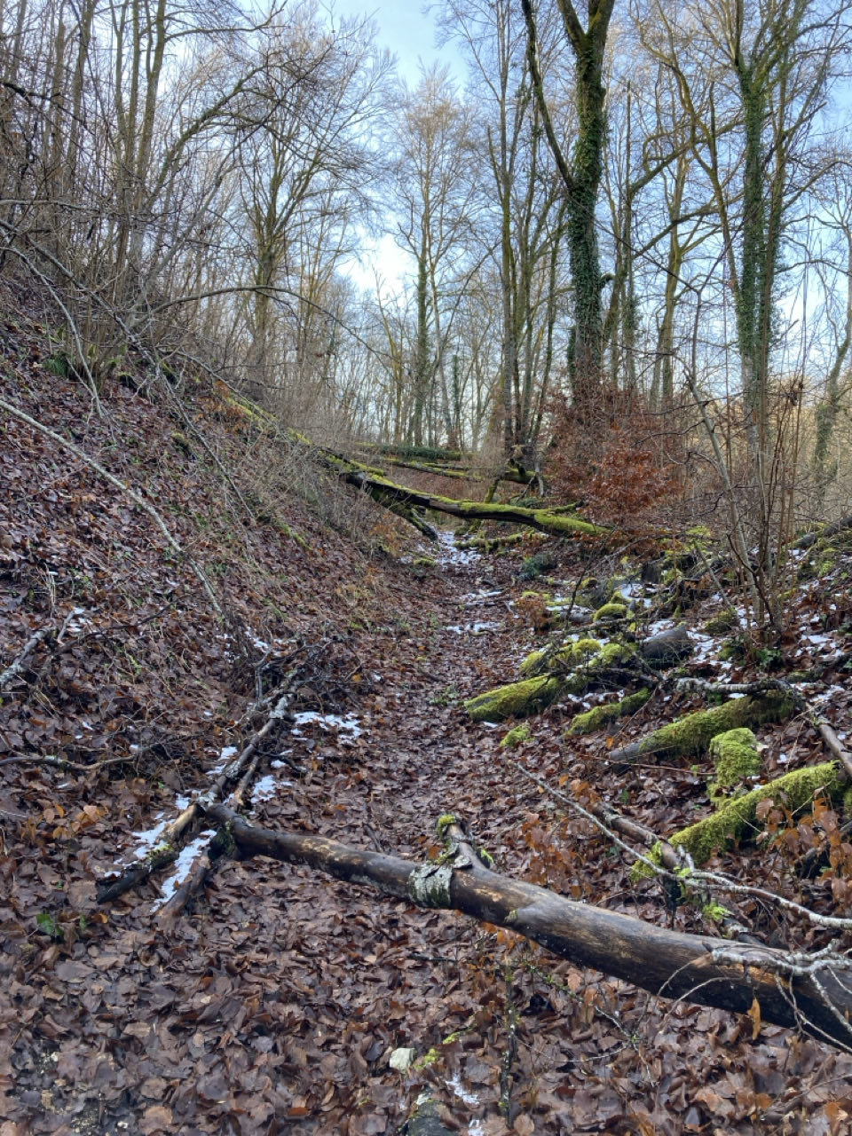 Dans fond de la vallée du Suzon, le froid est saisissant et la neige résiste. En remontant, ma progression est ralentie par des arbres tombés sur le chemin.