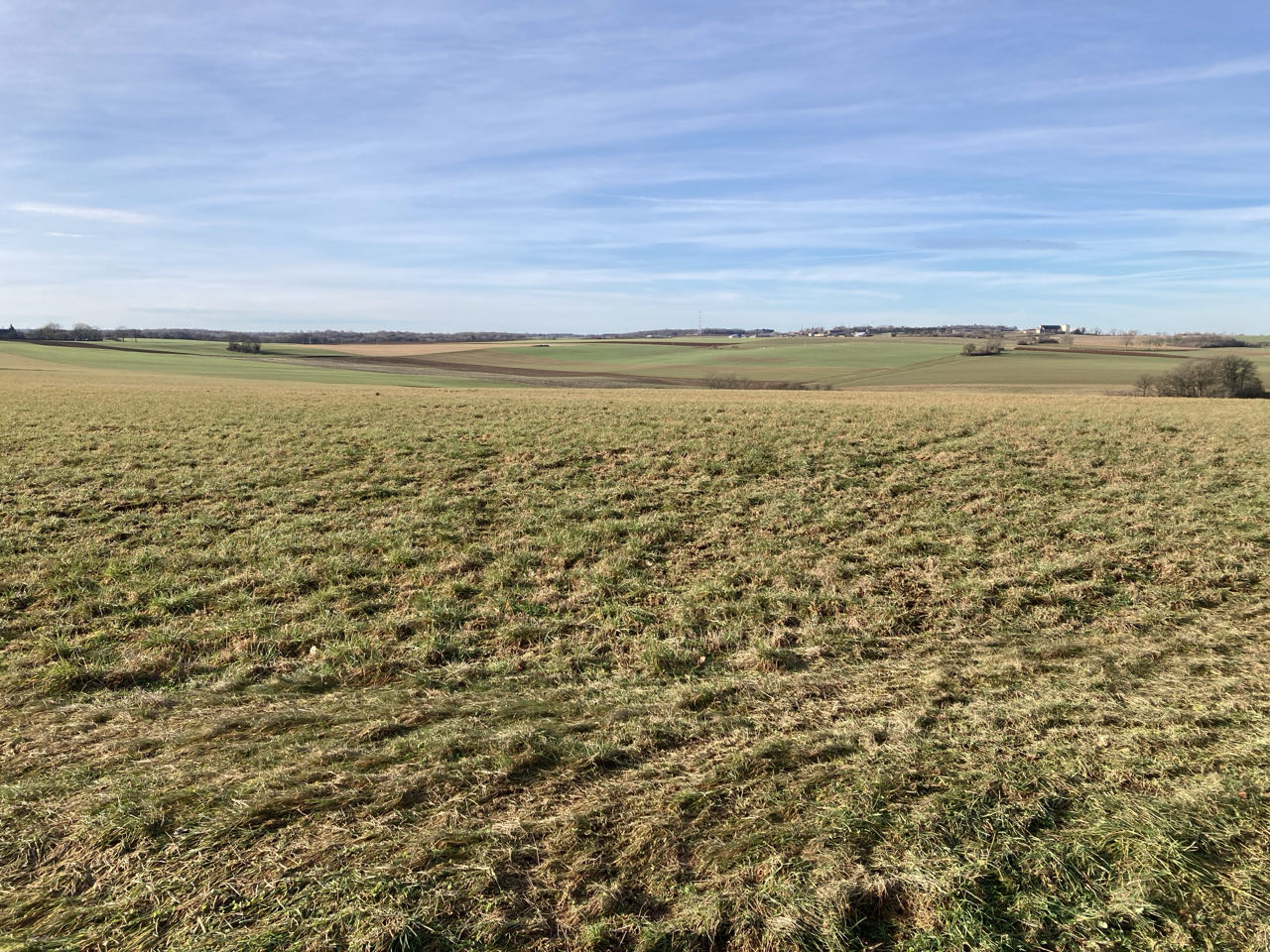 ☀️ Soleil et vent glacial. Paysages arrondis, larges collines couvertes de champs et de forêts. Grands aplats de couleurs marrons, verts ou noirs. Jeunes pousses dans certains champs. 🌱
