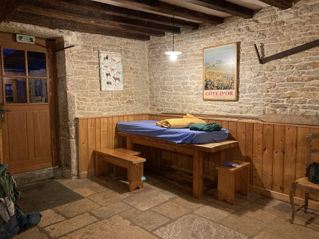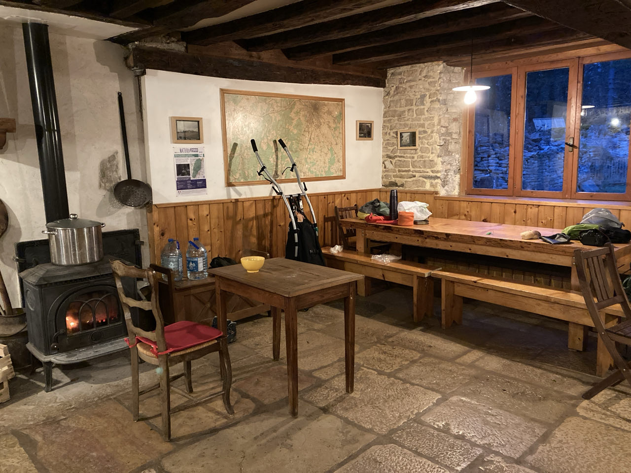 Plusieurs sentiers de randonnée passent devant le refuge mais il est isolé du village. C’est une ancienne ferme réaménagée. Les murs en pierre ont du mal à chauffer. 12 degrés et je suis au max avec le poêle ! 😅 Au sol, d’énormes pierres de bourgogne comme on en trouve dans les maisons du coin, magnifiques. L’électricité provient de panneaux solaires et l’eau est captée du puits. Pas d’eau chaude. Je me lave avec une bassine. Je pose une grosse casserole d’eau qui se réchauffe sur le poêle. Pour la cuisine, y’a le poêle ou du gaz. Je fais la vaisselle dans un évier taillé dans la pierre.