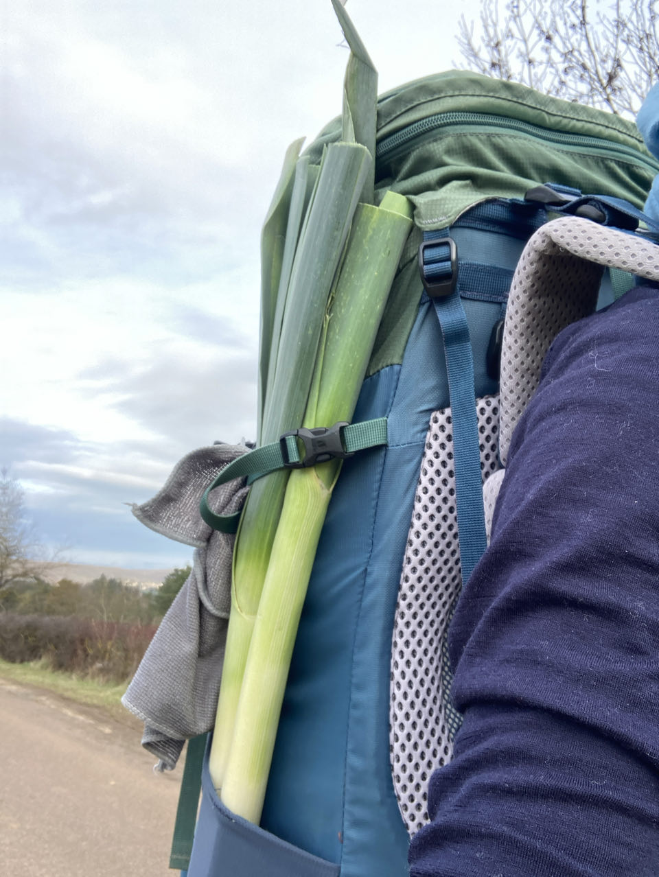 Je fais de grosses courses et j’achète plein de légumes et de fruits frais parce que… je vais dans un refuge pour quelques jours ! 🥳 À la caisse Colline est sympa et on discute pendant que je charge Rouletab, je ne suis pas sûre que tout va rentrer… Elle est a un gros ventre arrondi ! Les poireaux finissent sur mon sac, quel style 😁