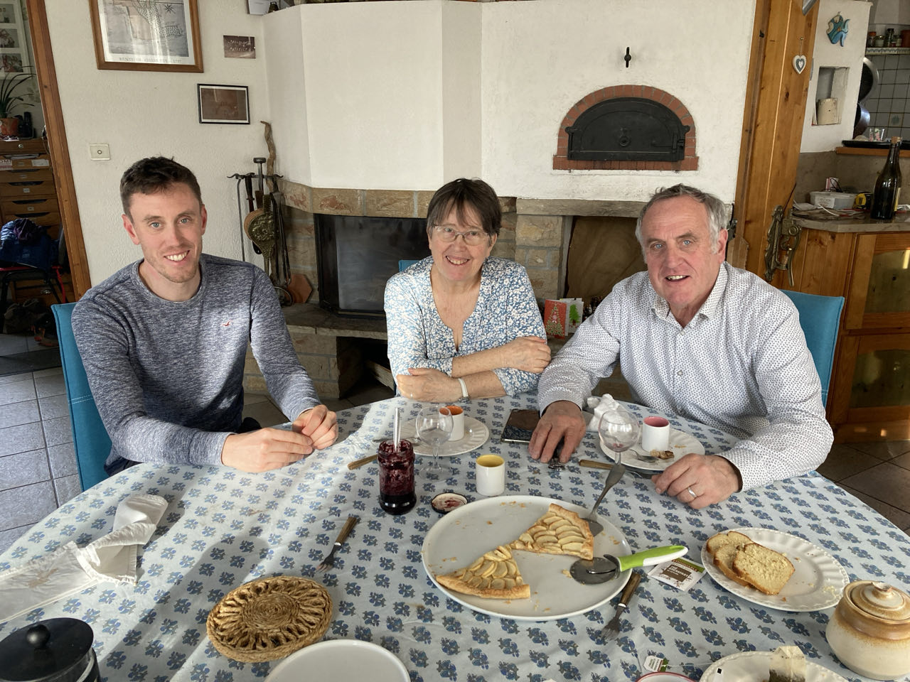 Dimanche, on a refait le stock de bois avec Dominique, 🪵 puis il m’a emmenée chez lui où j’ai déjeuné avec sa femme Anne-Marie et leur fils Paul. Dominique qui adore la cuisine me fait goûter une spécialité : les œufs avec une sauce au vin et au cassis, très bon ! Après, balade sur le mont Afrique avec l’énorme pylône de télécommunications et une belle vue sur les alentours.