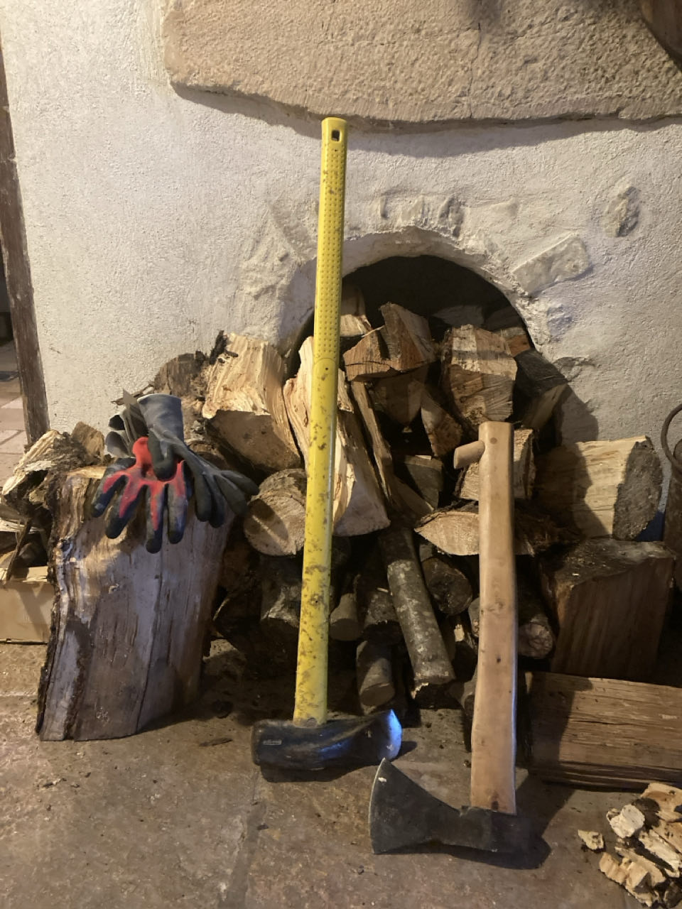 Hier, je suis descendue au village chez François et Evelyne pour chercher des livres (pour m’occuper), une hache et un merlin (pour faire du bois).