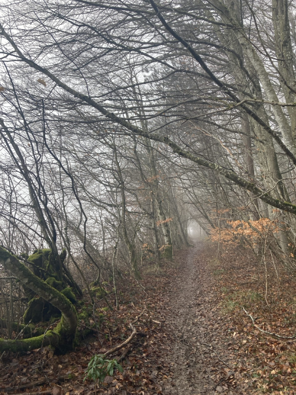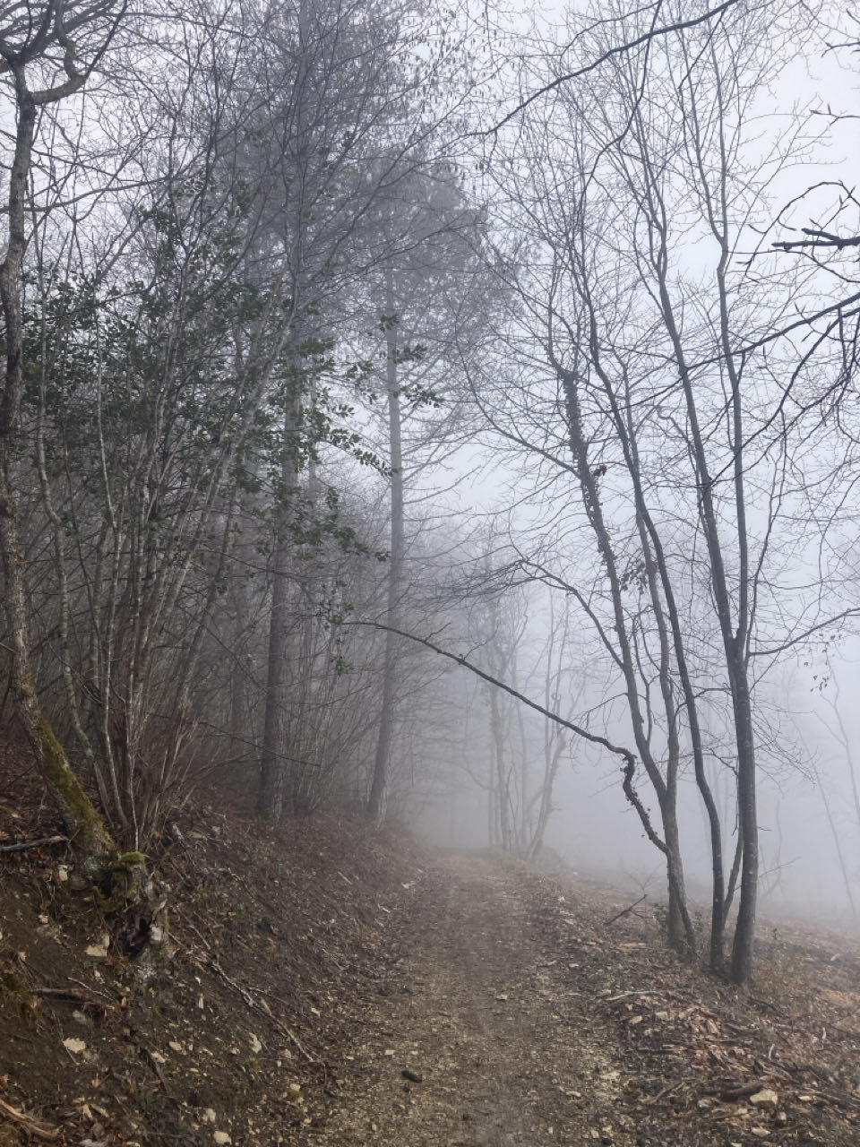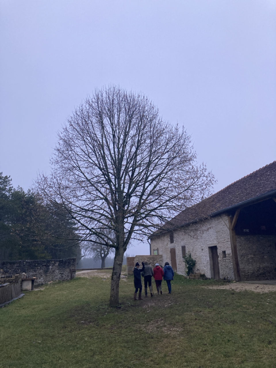Herbe blanche. Pluie gelée sur les branches. Du vent et les arbres gouttent. Brouillard enveloppant. Humidité blanche. Silhouettes brumeuses. Gilet orange. Bidon d’eau. Hache dans le sac. Descente au village. Chaleur dans la maison de bois. Chez Evelyne et François avec Edith et Danielle.