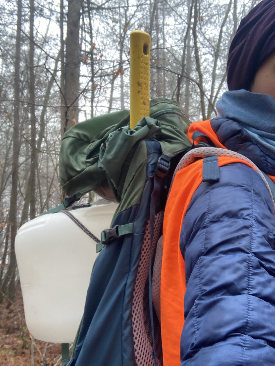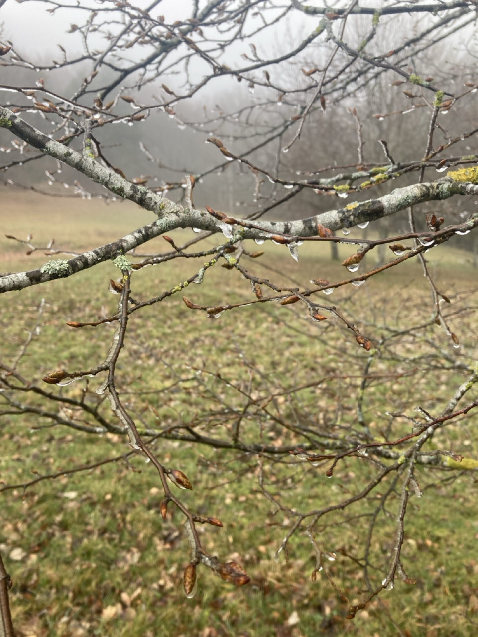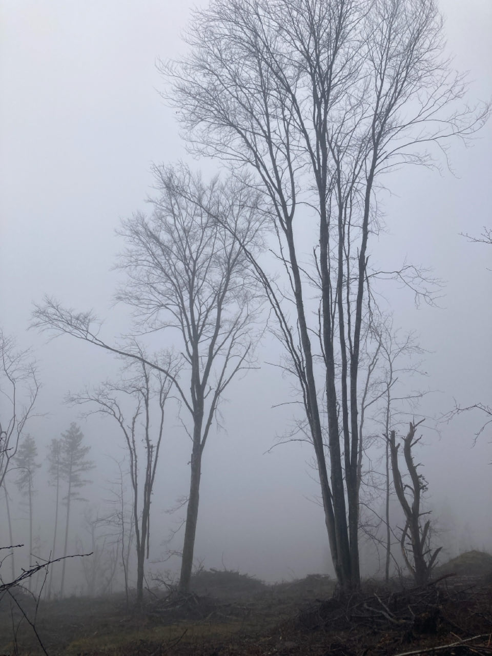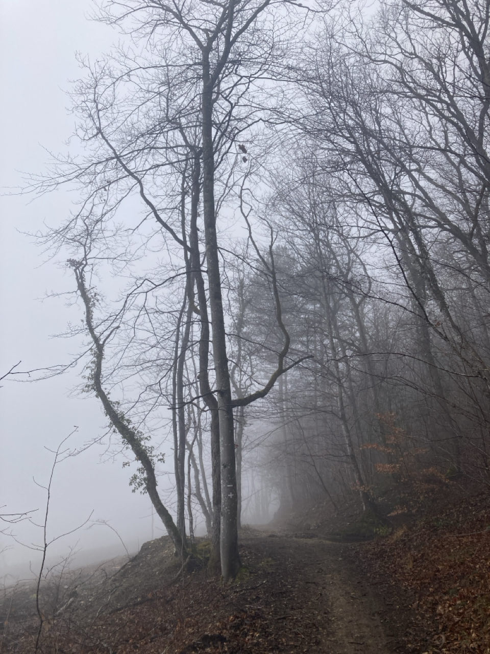 Herbe blanche. Pluie gelée sur les branches. Du vent et les arbres gouttent. Brouillard enveloppant. Humidité blanche. Silhouettes brumeuses. Gilet orange. Bidon d’eau. Hache dans le sac. Descente au village. Chaleur dans la maison de bois. Chez Evelyne et François avec Edith et Danielle.