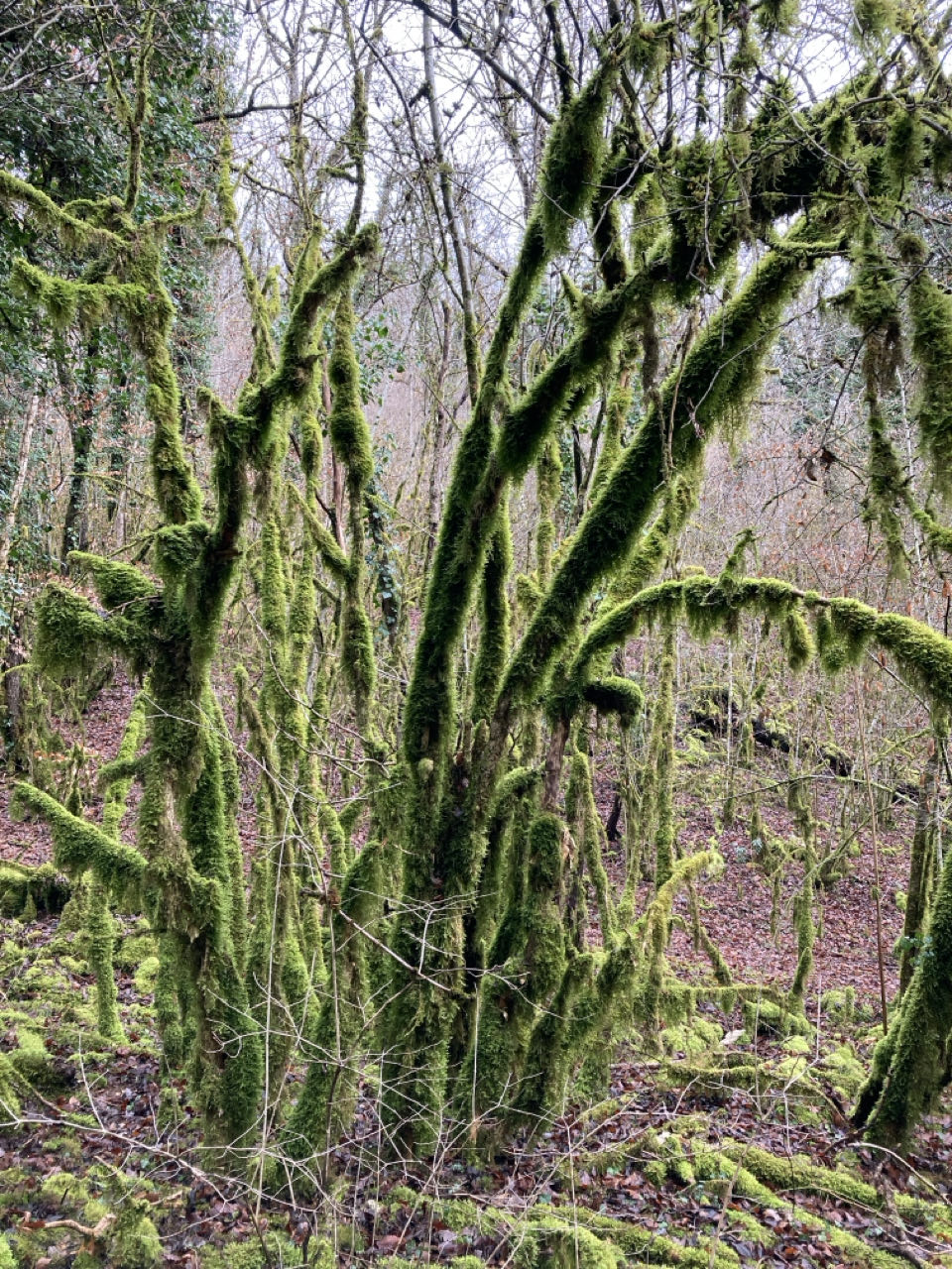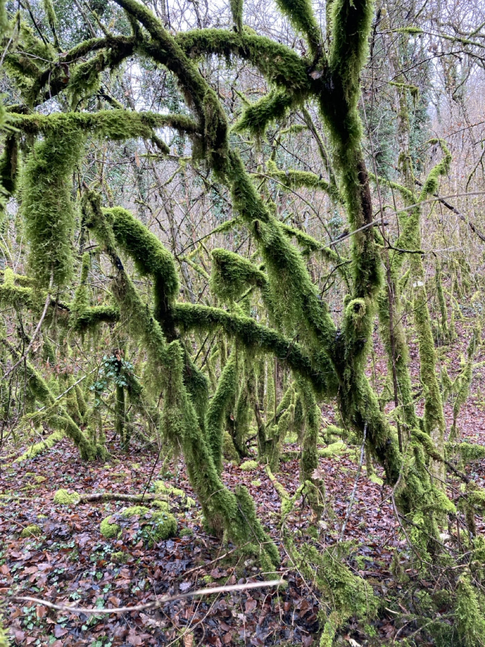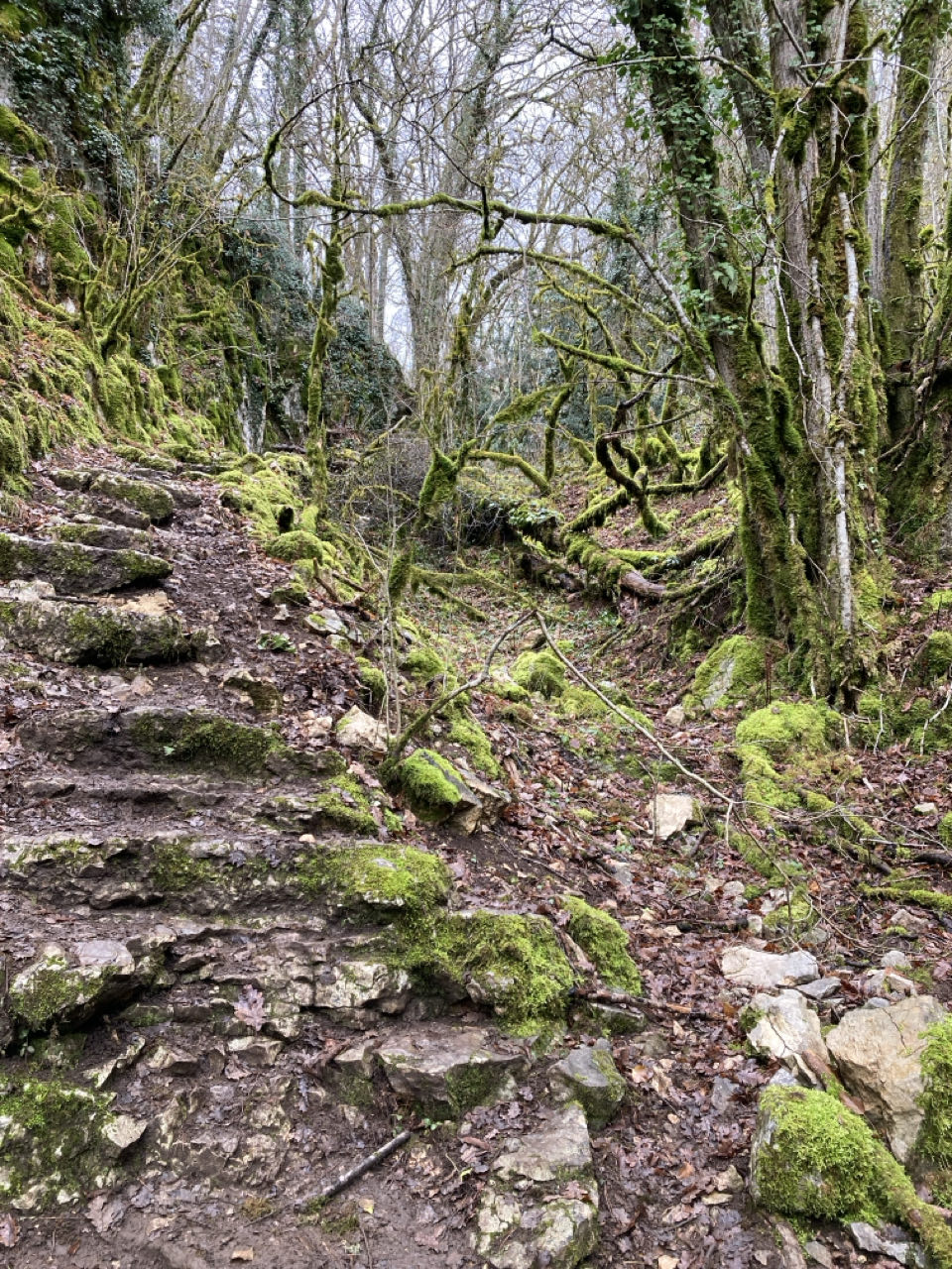 Au fond de la combe de Brochon, l’humidité goutte des branches et les mousses sont partout. Sur le sol, les souches, les pierres, les escaliers taillés dans la falaise, les arbres. Il y a de quoi s’émerveiller du moindre détail.