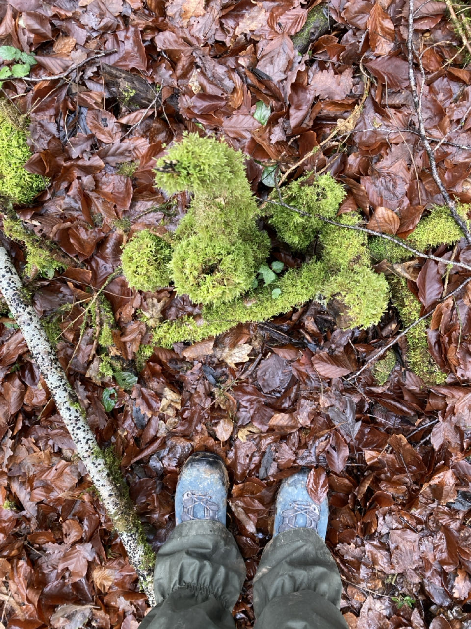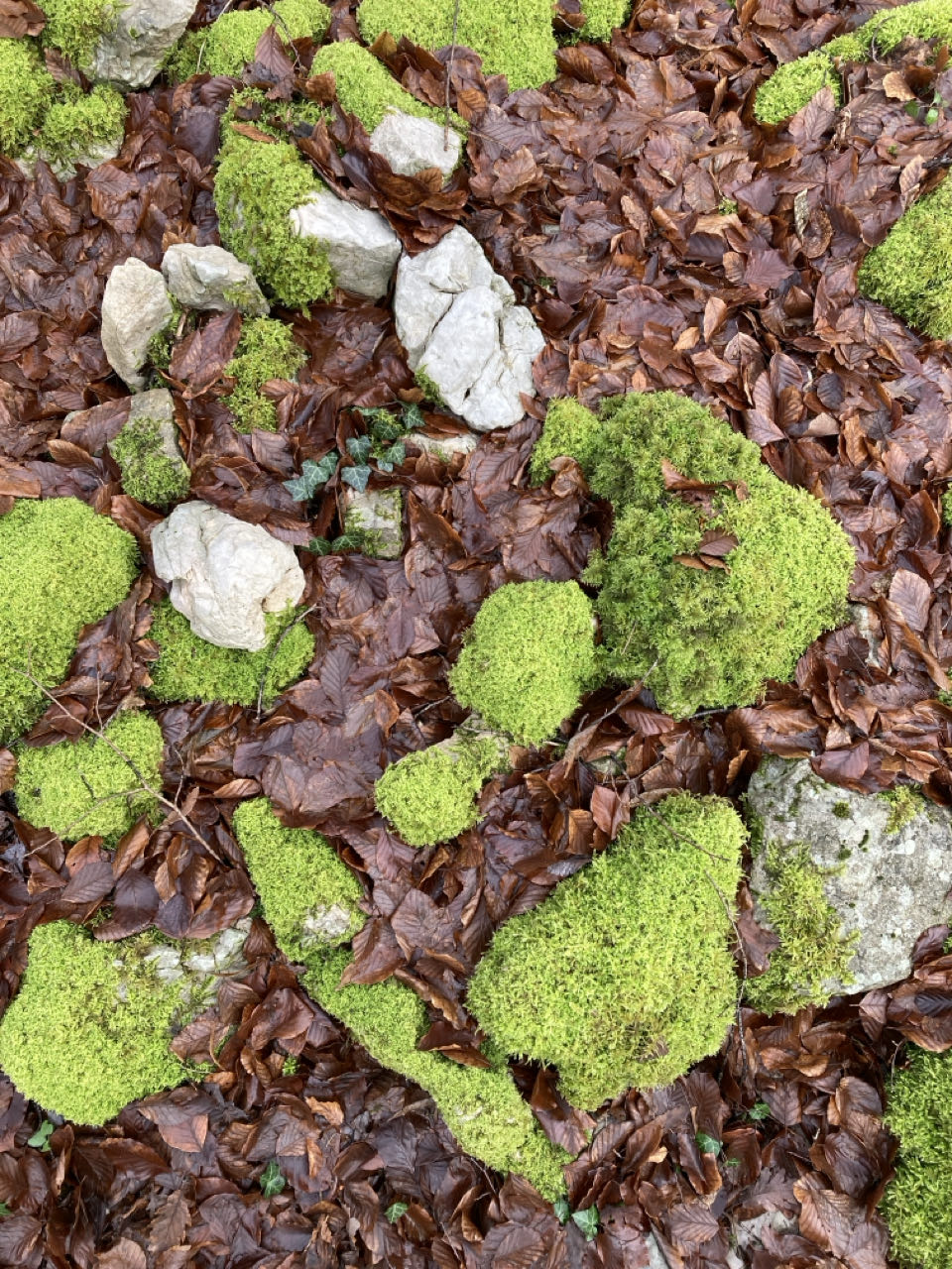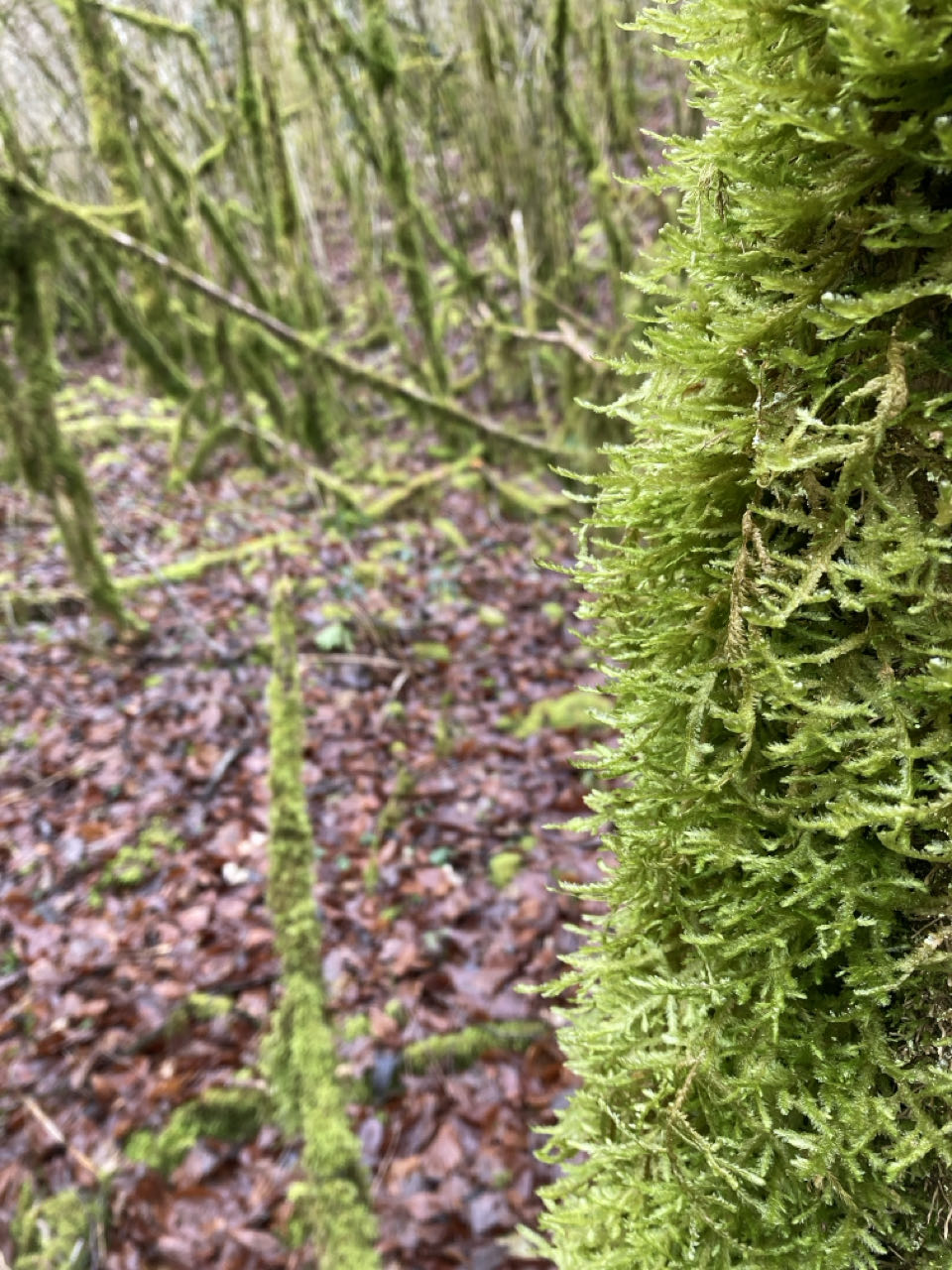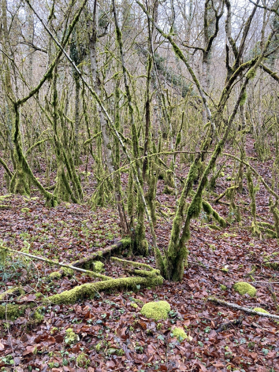 Au fond de la combe de Brochon, l’humidité goutte des branches et les mousses sont partout. Sur le sol, les souches, les pierres, les escaliers taillés dans la falaise, les arbres. Il y a de quoi s’émerveiller du moindre détail.