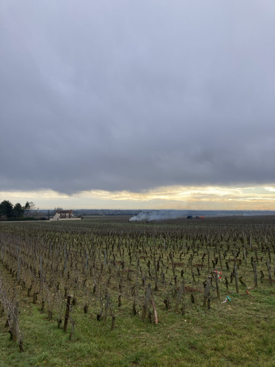 Des silhouettes travaillent dans les allées, coupent et brûlent les sarments dans les champs. Pour les personnes comme moi qui s’y connaissent davantage en tomate qu’en vigne, les sarments, c’est comme les gourmands pour les tomates ! 🍅