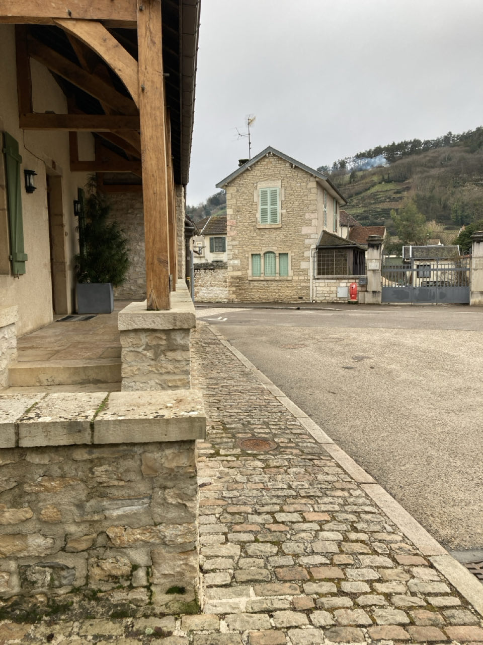 J’ai quitté la côte de Nuits pour arriver en côte de Beaune. Passage devant la carrière de Comblanchien. D’après Claude que j’ai croisé ce midi, c’est l’une des plus grandes carrières de calcaire de France. À Magny-lès-Villers, Steeve et son fils Lucas me donne de l’eau chaude 😊 Plus loin, une famille travaille dans ses vignes et refait les rangées de fils où s’enroulent les vignes. « Il faut de la dextérité pour faire ça. On en profite pendant qu’il fait beau. On ne peut pas le faire quand on a froid aux mains. »
