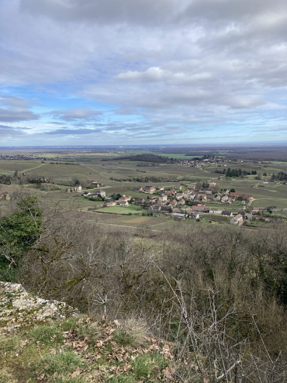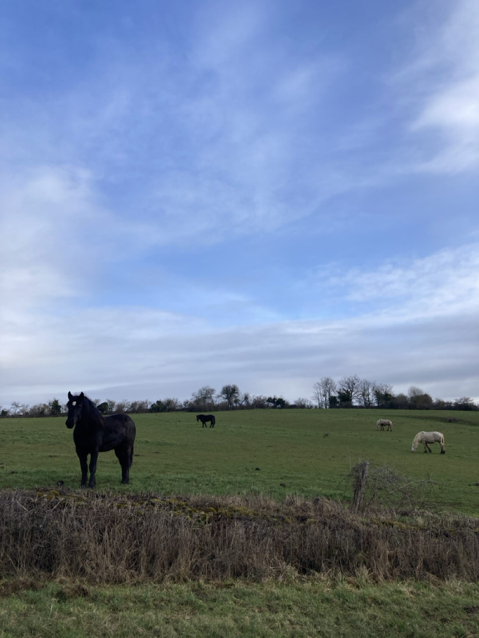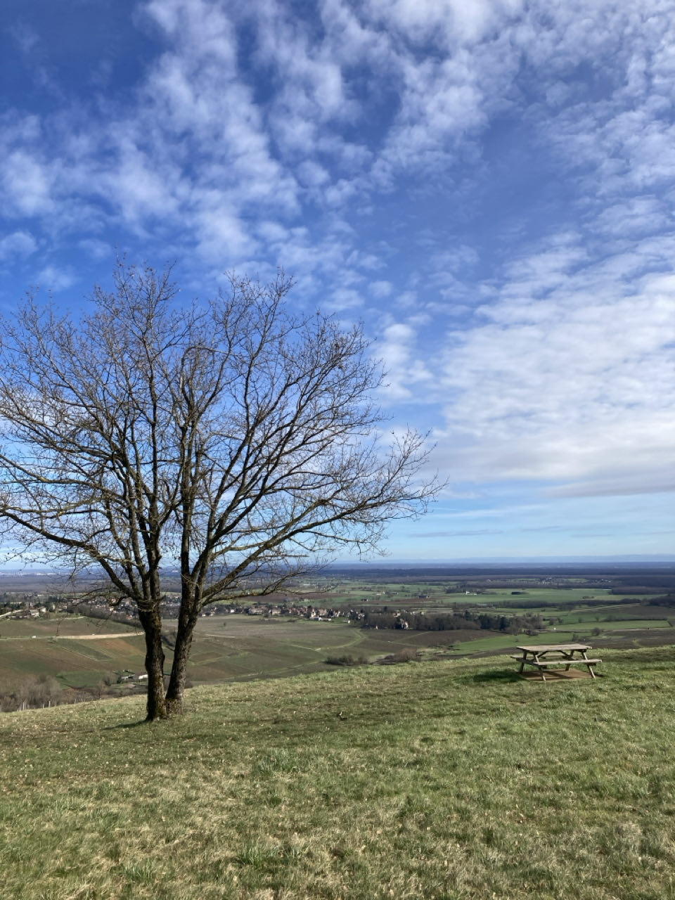 Sur les crêtes toute la journée et (incroyable) il ne pleut pas ! La vue est dégagée et j’aperçois le Mont Blanc. 🏔️ J’aime beaucoup cette partie du GR de la côte châlonnaise. Les paysages sont variés : boisements, maillage bocager, prairies sauvages, prés, quelques champs cultivés et des petits villages. Y’a beaucoup de chevaux dans ce coin. 🐴
