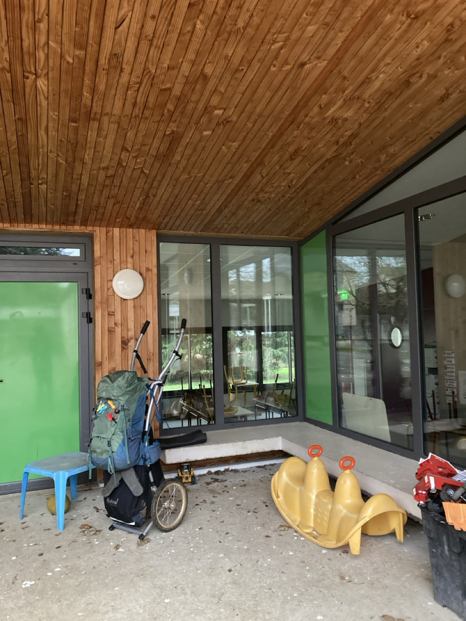 17h. Je m’abrite du vent sous le préau de l’école de Cormatin. La grille était ouverte. Vacances scolaires, les jeux dans la cour sont rangés, petit rebord pour poser mon matelas, invisible depuis la rue, mais je n’ose pas y dormir.