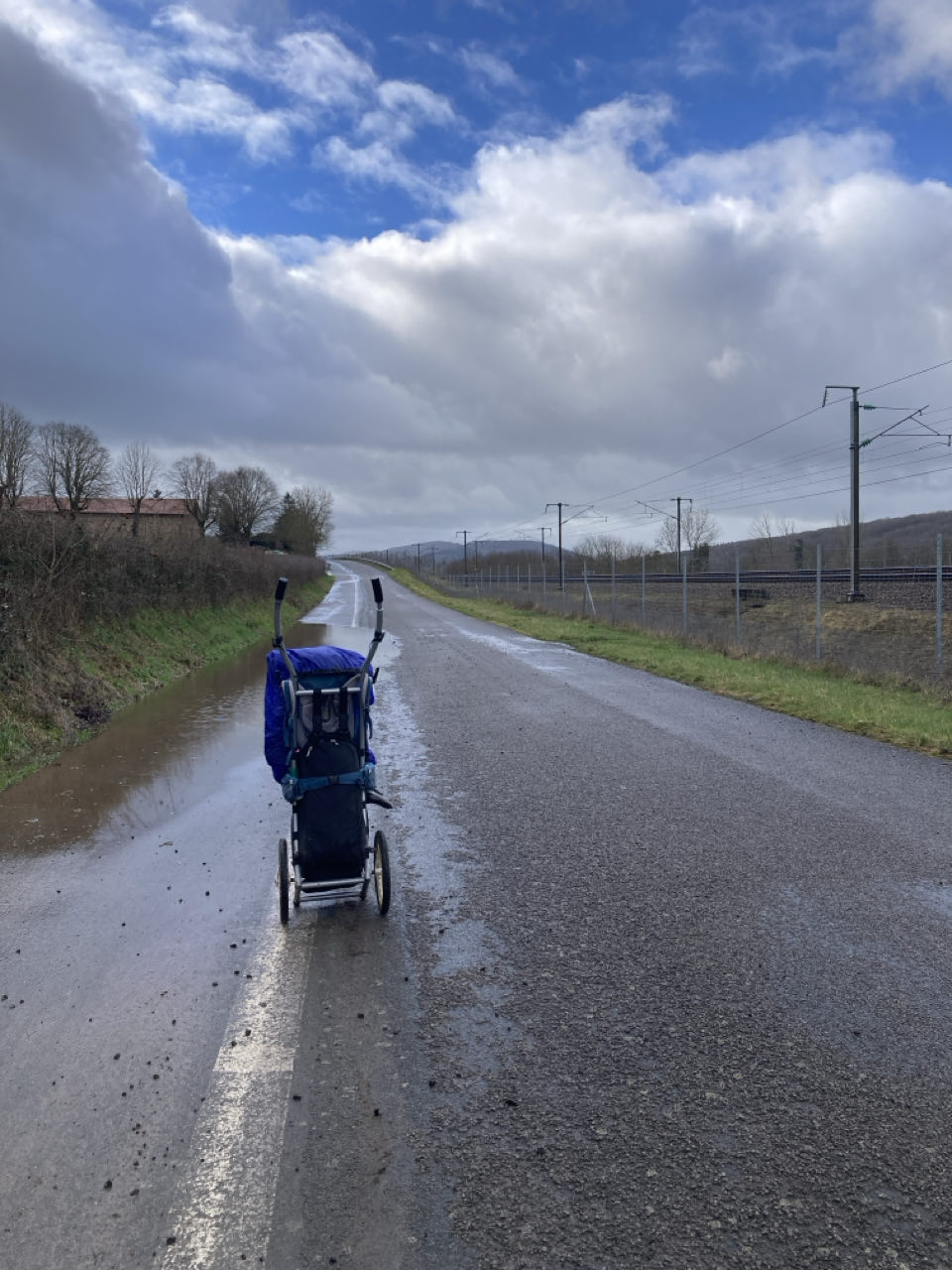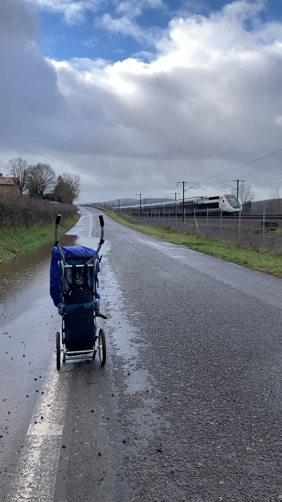 Je passe devant une « déchèterie » de poubelles, je longe la ligne de TGV et finis par traverser une voie d’autoroute… de vraies coupures dans le territoire qui contraignent les déplacements. Le tunnel de la voie cyclable est condamné, je me retrouve sur la route, un détour… Heureusement il n’y a pas trop de circulation. Et ces averses qui ne se lassent jamais. ☔️