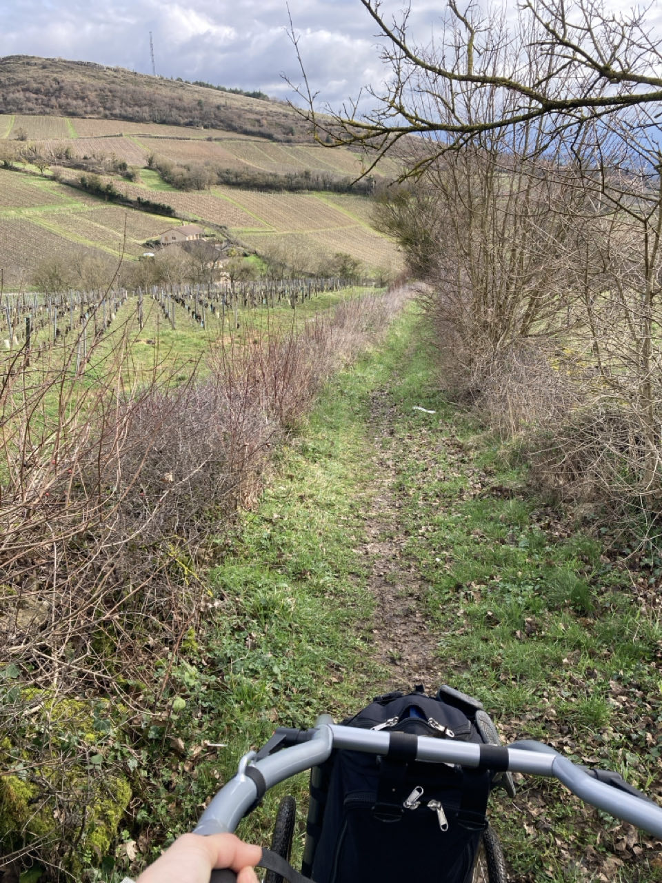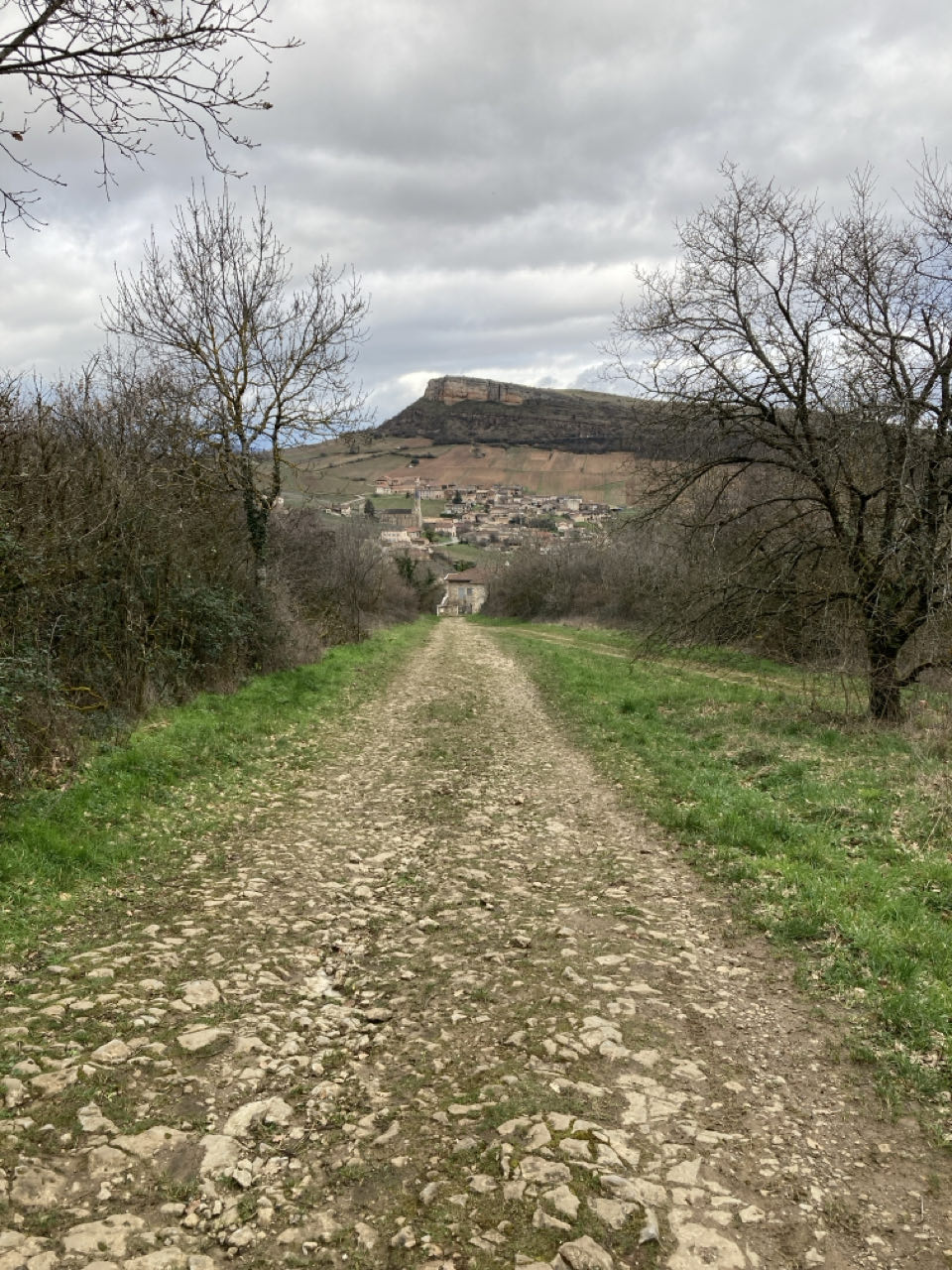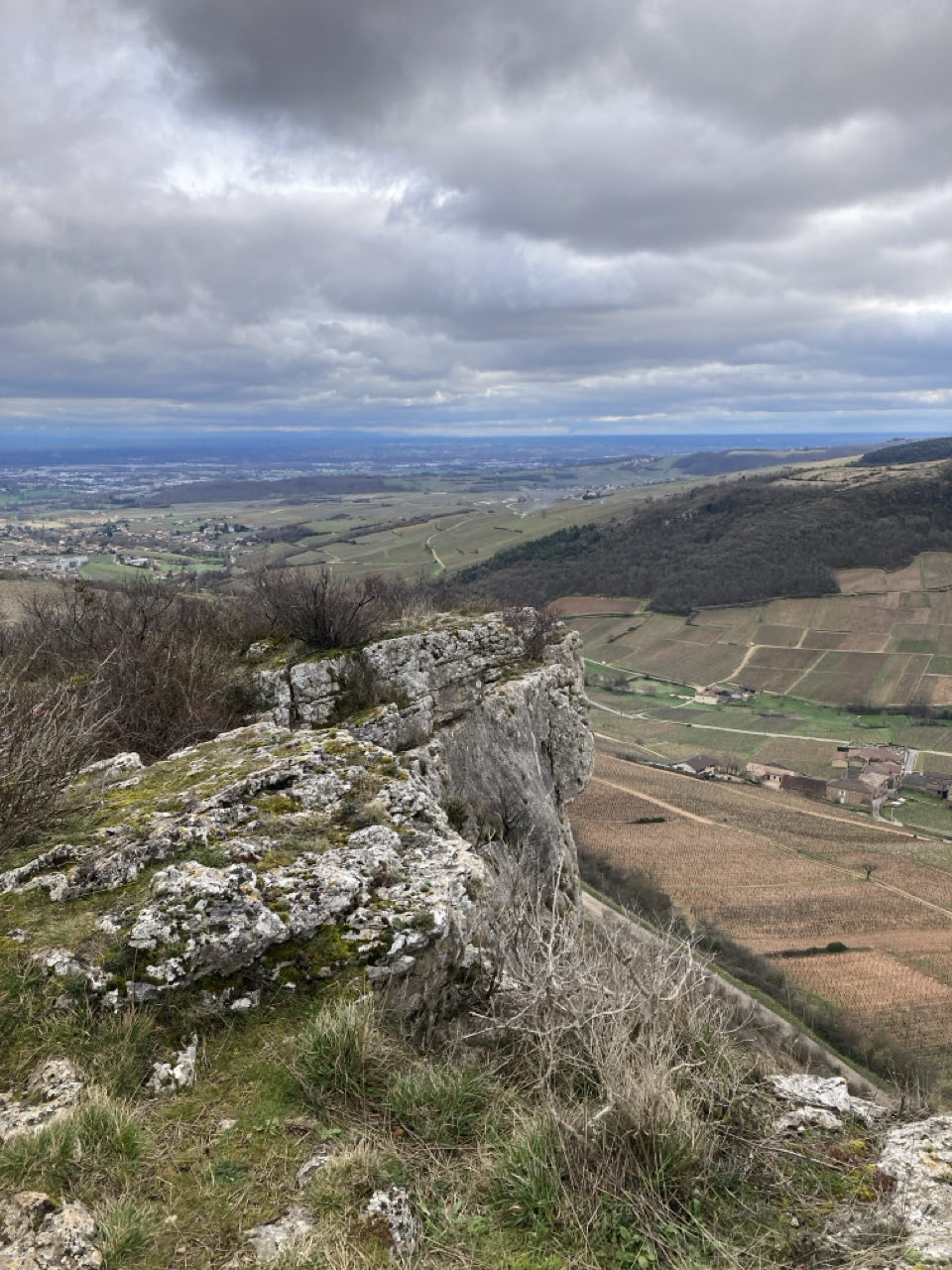 Ensuite, la roche de Vergisson où je pensais bivouaquer en bas de la falaise, mais un van était installé alors je suis partie. Grand vent et belle vue au sommet. Au choix : chemins caillouteux et irréguliers ou boueux et glissants.