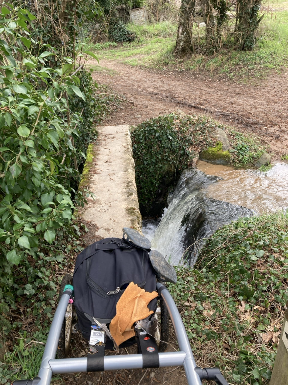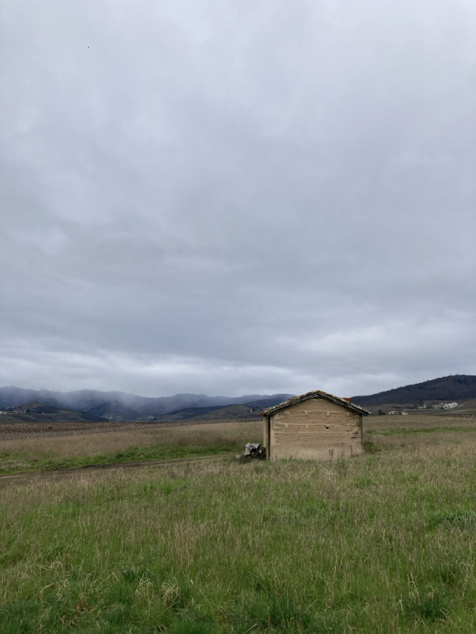 En haut, il y a un mini abri qui m’est bien utile. 👌 Je m’y installe, je bois et je mange des gâteaux. Je ne monte pas ma tente tout de suite, j’attends que les gens dans les champs s’en aillent. Tout est de nouveau détrempé 🙂↔️ mais il ne fait pas froid, c’est déjà ça.