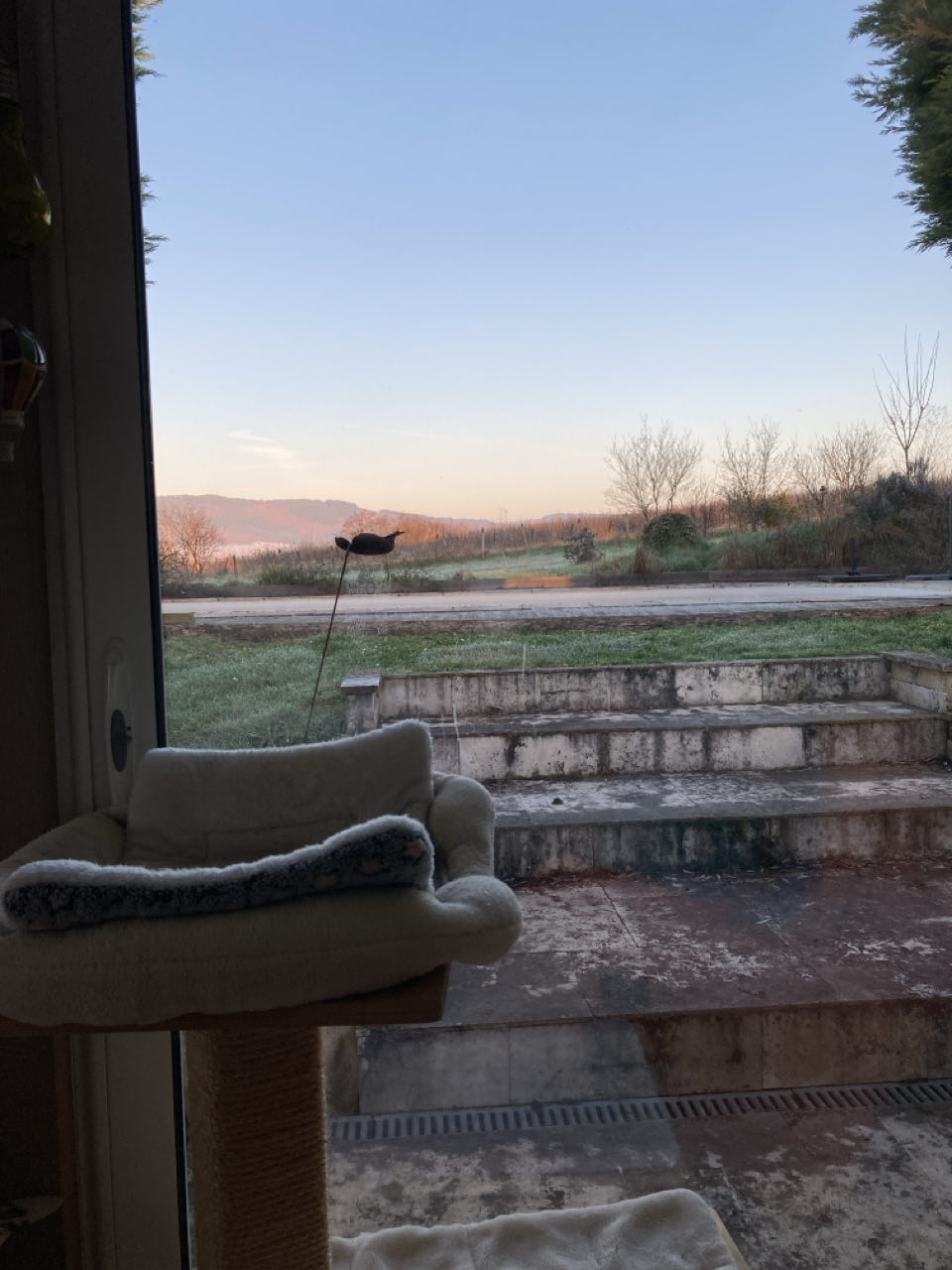 Soirée très agréable et je dors dans la véranda entièrement en baies vitrées 🤩 Ce n’est pas le point de vue que j’espérais mais c’est très beau quand même ! Certains chats font les fous dans la nuit sur et sous le canapé où je dors 🙃