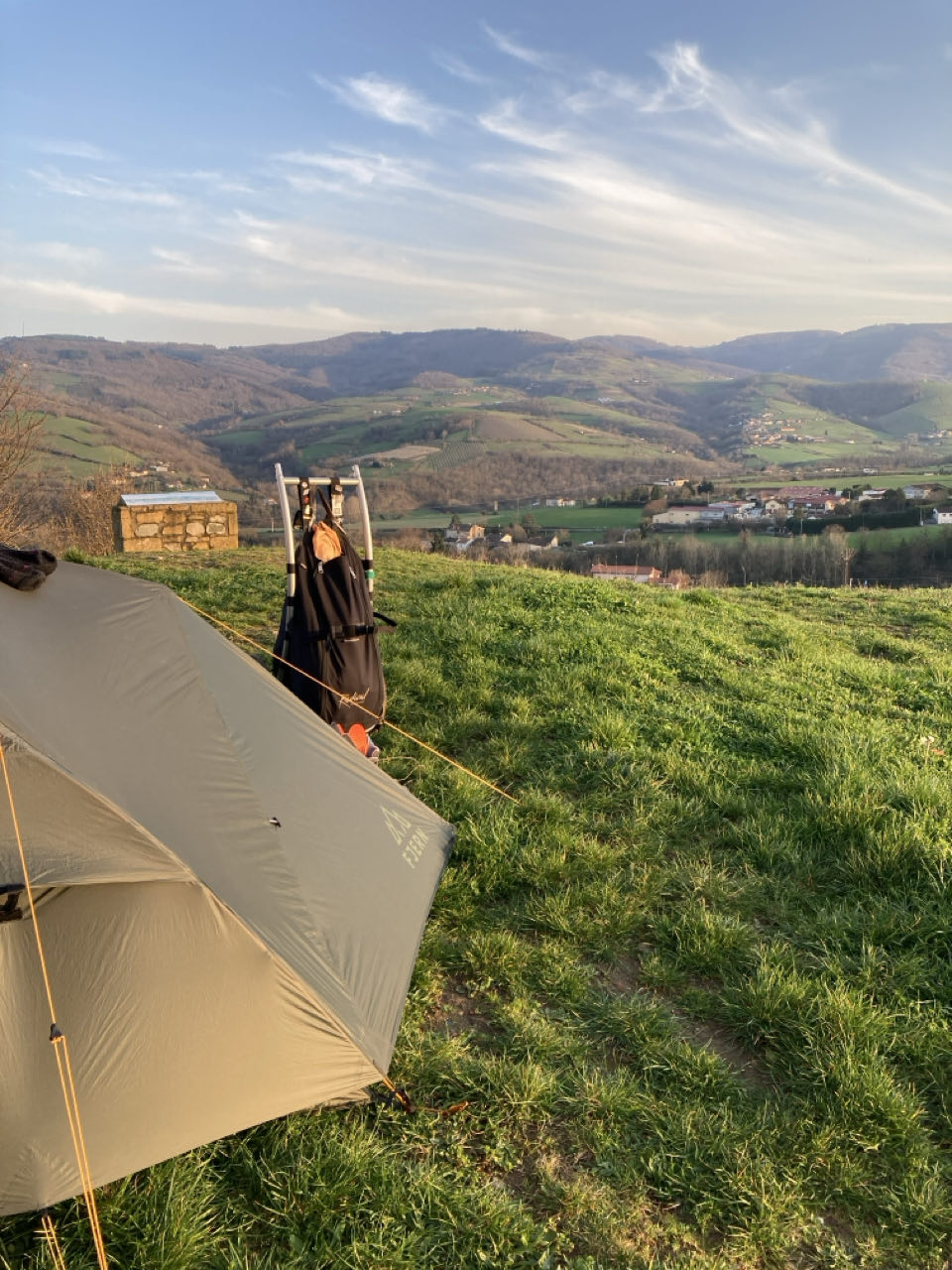 17h30. Je plante la tente sur une butte près d’une chapelle.