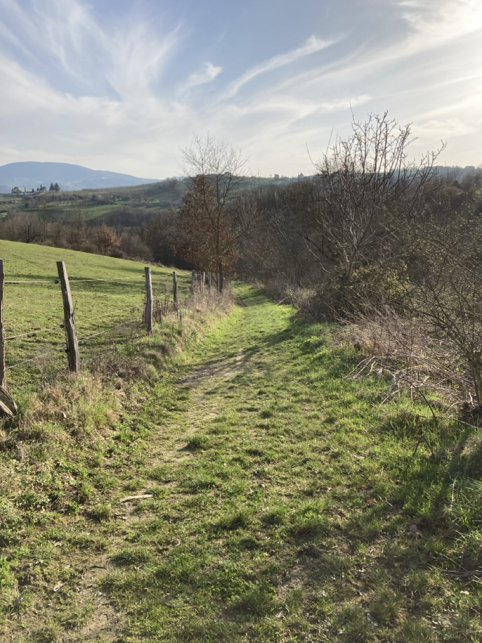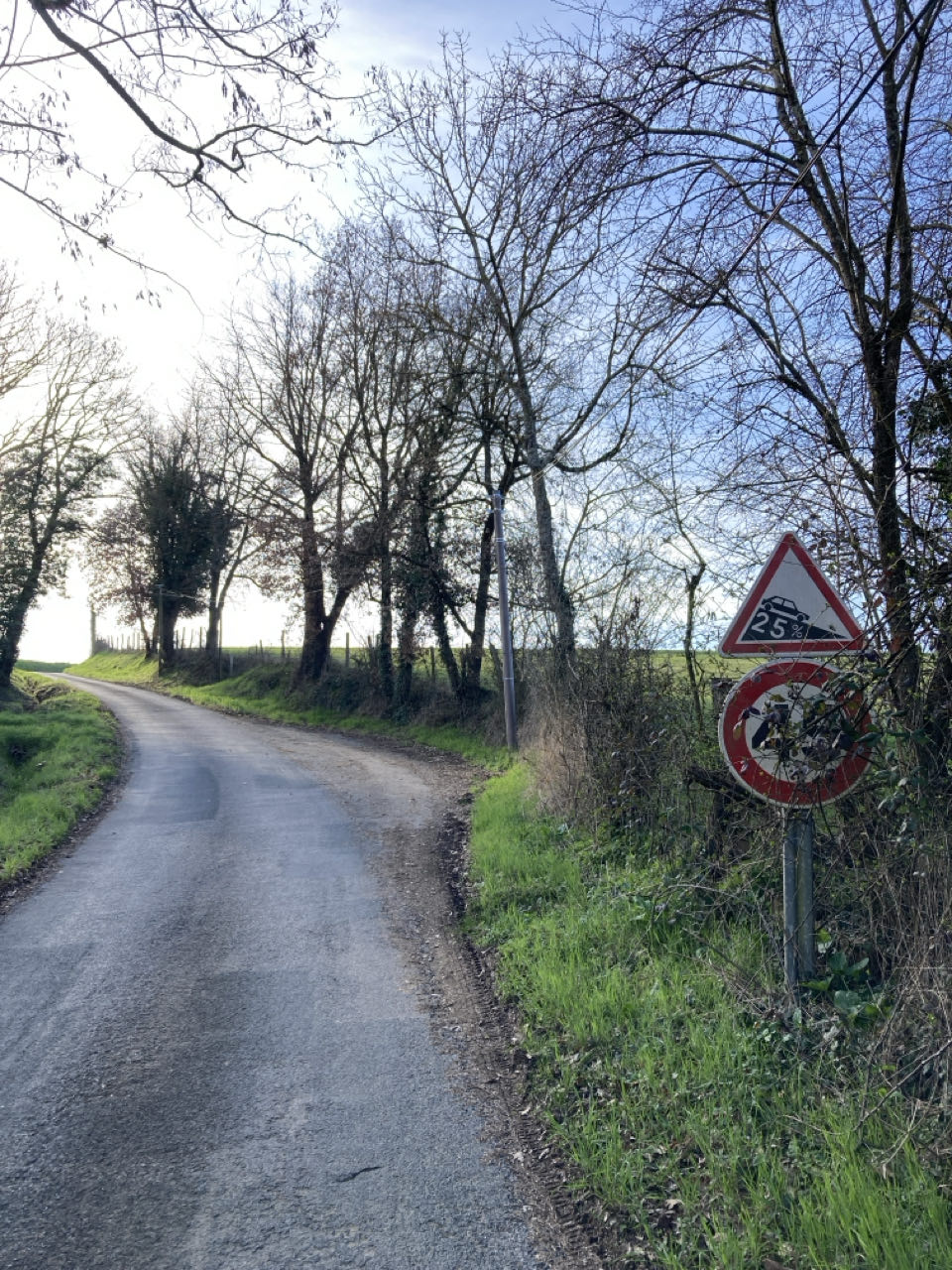 Coincée sur une route très empruntée… Ça roule trop vite. Je trouve cela dangereux d’y marcher pendant 30 minutes. Je fais un détour. Et ça remonte et ça redescend. Encore des kilomètres… alors que j’en ai déjà plein les jambes.