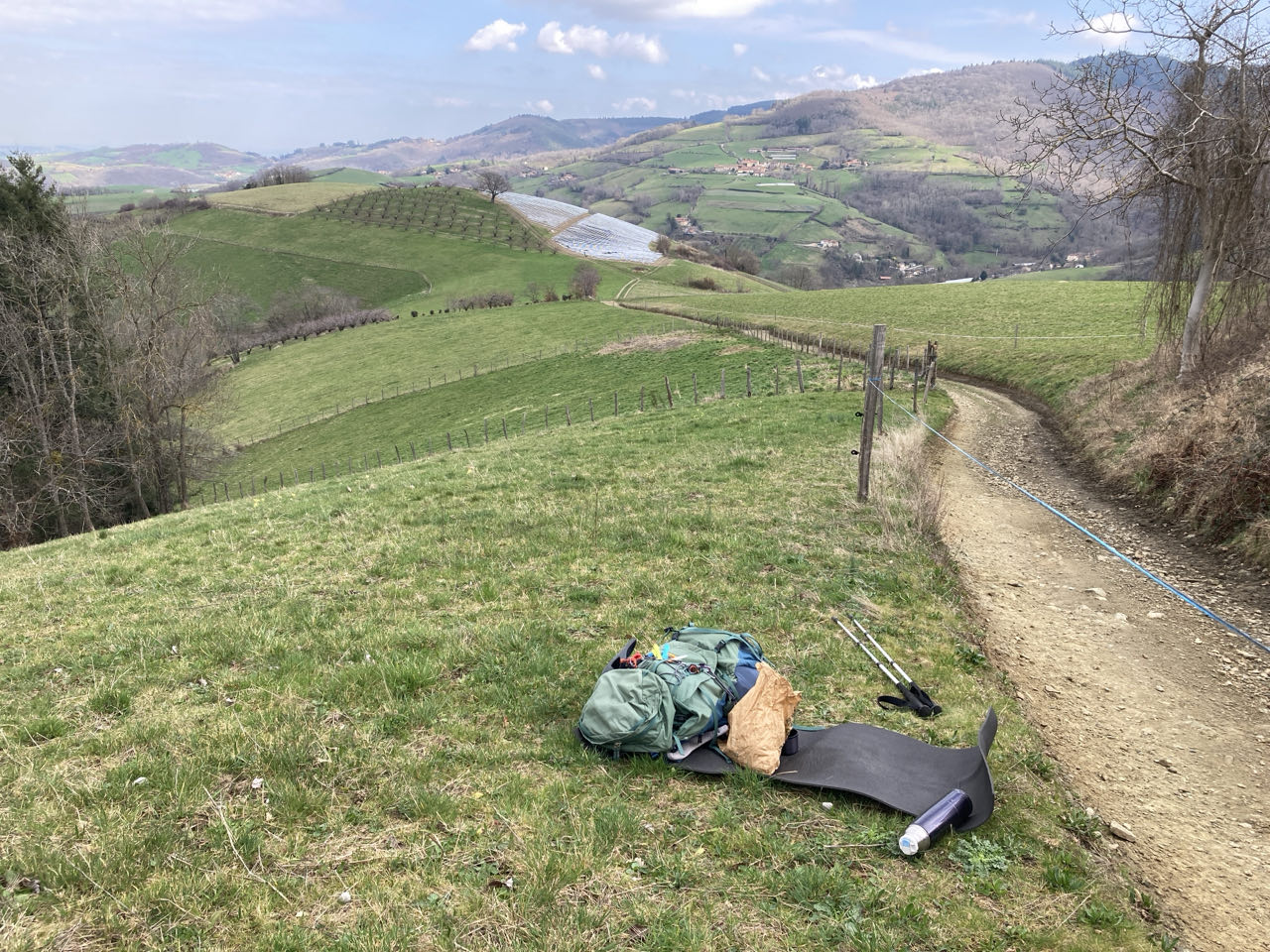Rouletab est chargée dans le coffre de la voiture et je pars seulement avec mon gros sac. C’est confortable et j’avance vite dans la montée jusqu’au col. Je retrouve les sensations de la marche avec des bâtons et ça me fait fort plaisir !