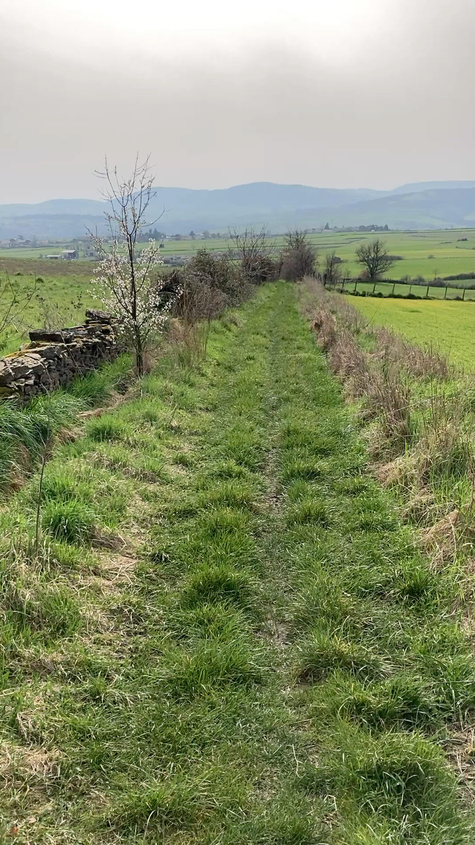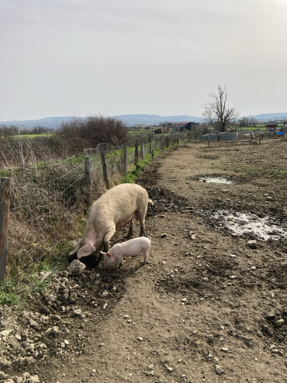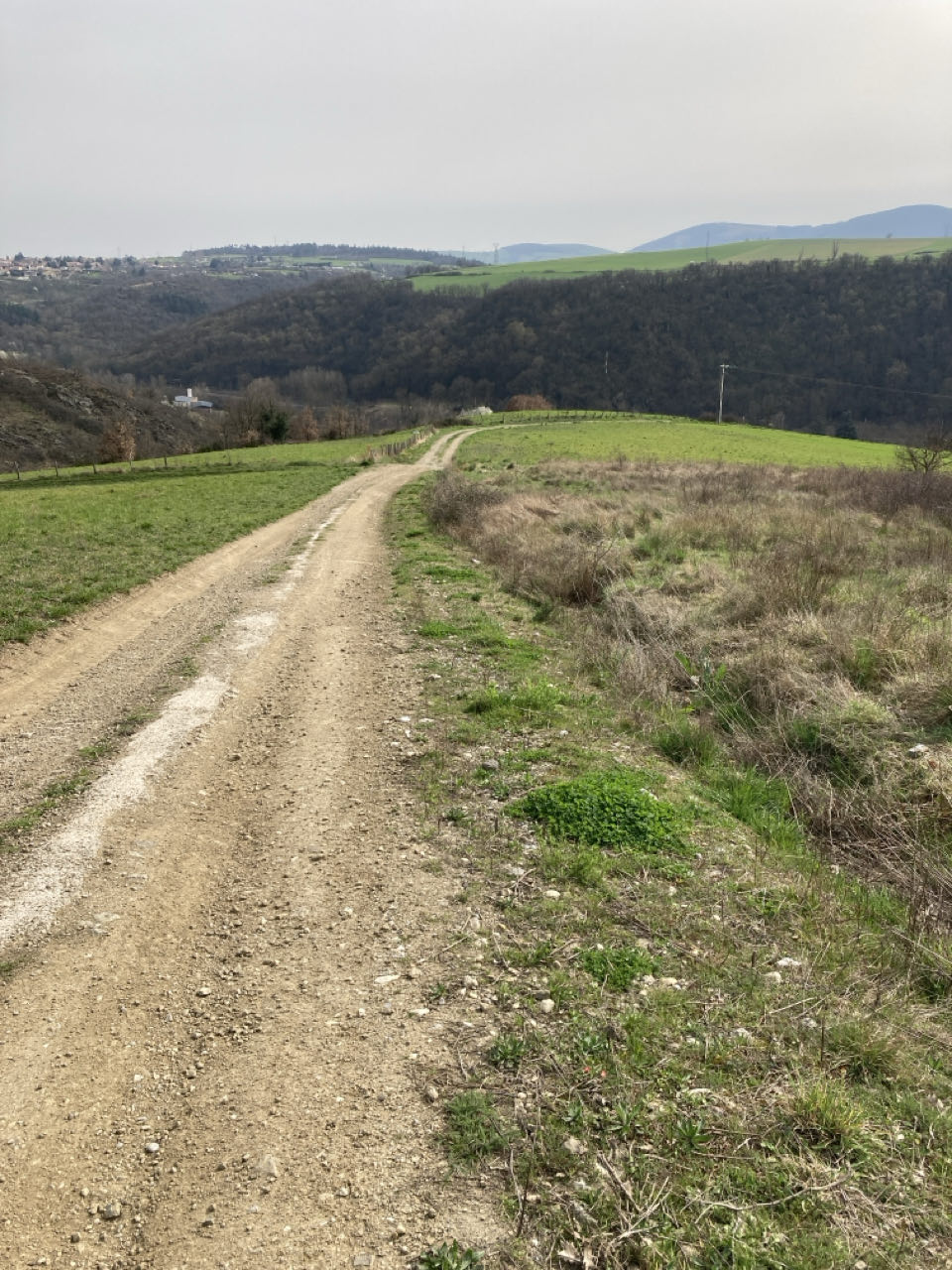 Ciel blanc. Derrière moi les monts du Lyonnais ; devant, les monts du Pilat. Moi au milieu, assise sur mon matelas en mousse sur le chemin pour le pique-nique. Un groupe de choucas s’envole en poussant de légers cris métalliques. Les abeilles se noient dans les fleurs de prunus. 🐝 Dans la plaine, des troupeaux de vaches, des cochons en plein air, des champs, des murets de pierre sèche, des villages, des petites routes qui maillent la campagne.