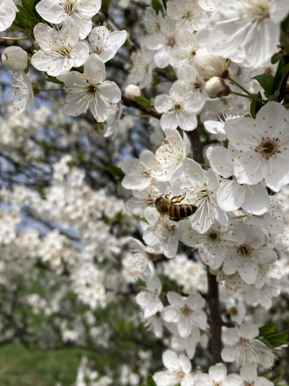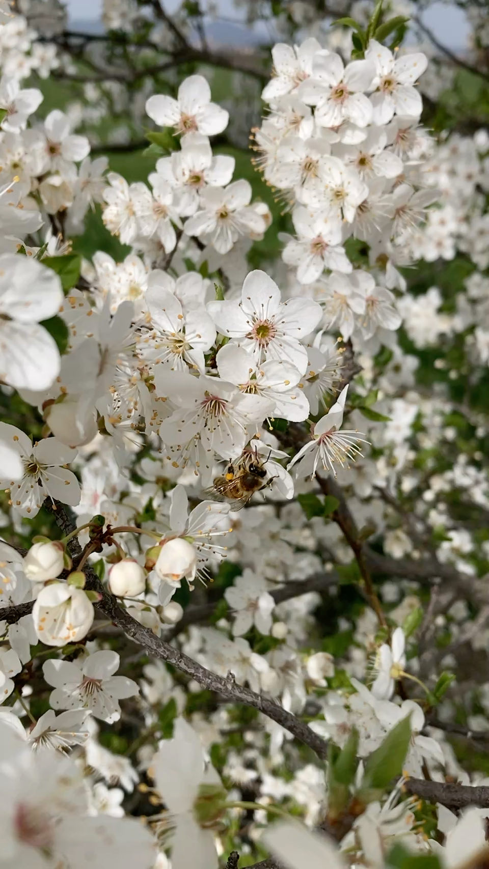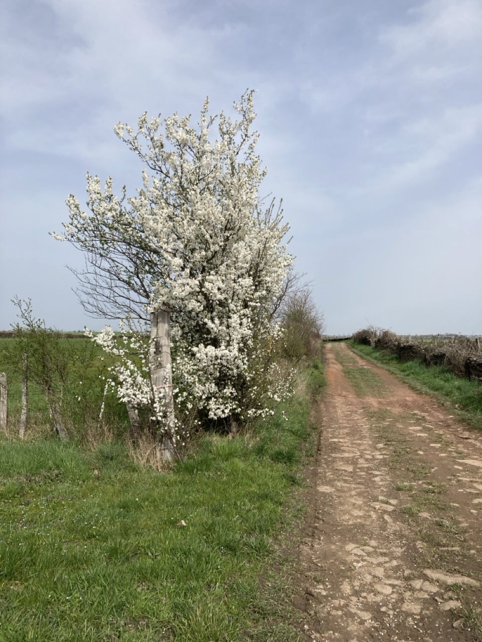 Ciel blanc. Derrière moi les monts du Lyonnais ; devant, les monts du Pilat. Moi au milieu, assise sur mon matelas en mousse sur le chemin pour le pique-nique. Un groupe de choucas s’envole en poussant de légers cris métalliques. Les abeilles se noient dans les fleurs de prunus. 🐝 Dans la plaine, des troupeaux de vaches, des cochons en plein air, des champs, des murets de pierre sèche, des villages, des petites routes qui maillent la campagne.