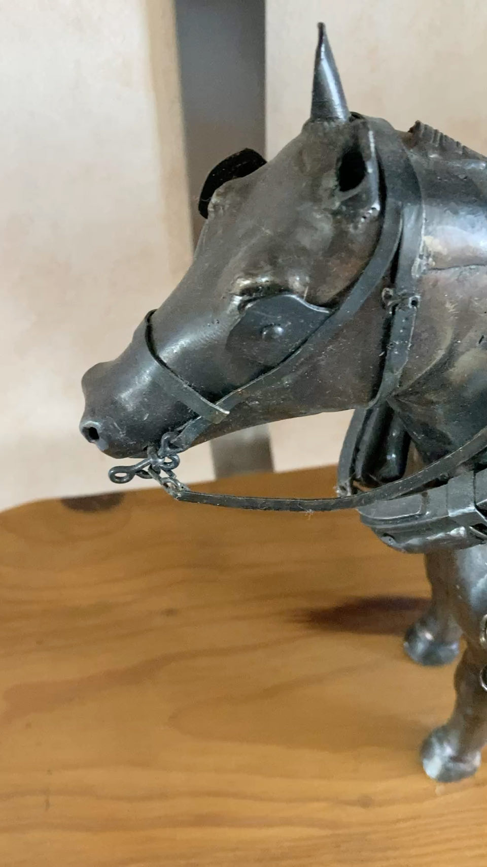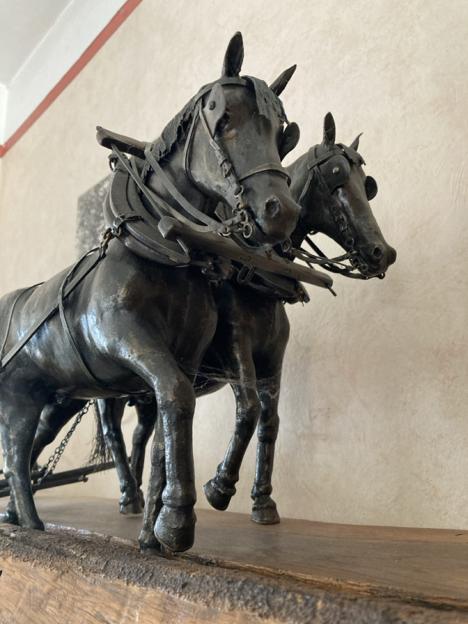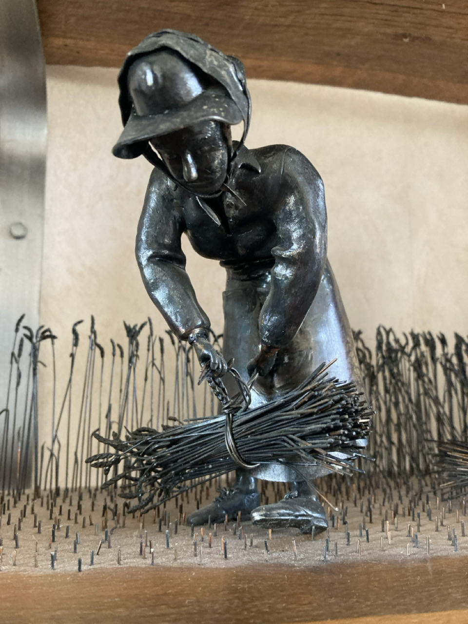 Les sculptures en métal sont des œuvres du père de Sylvie. Un travail de minutie épatant avec pleins de pièces articulées, des répliques d’outils agricoles en miniature.