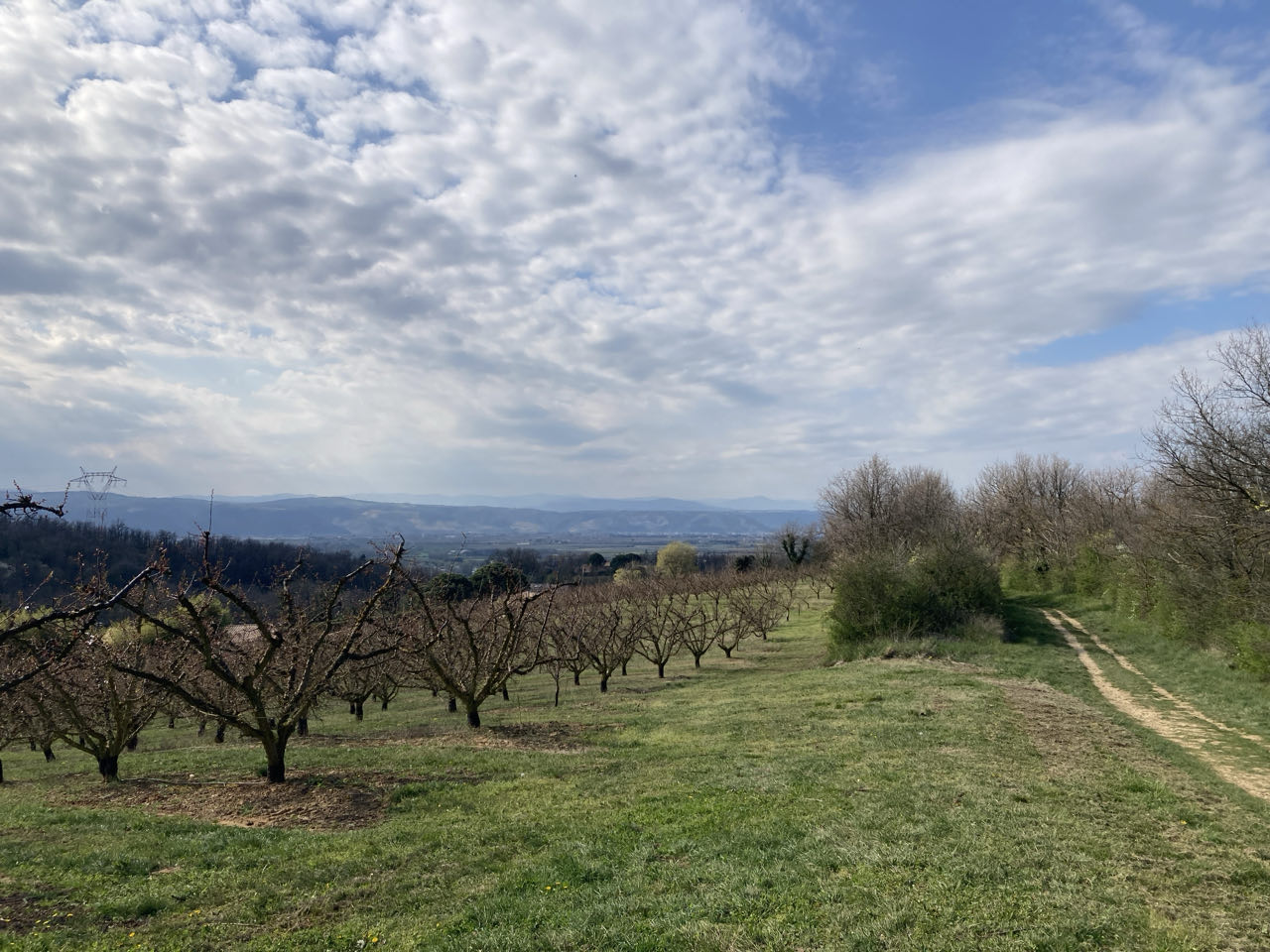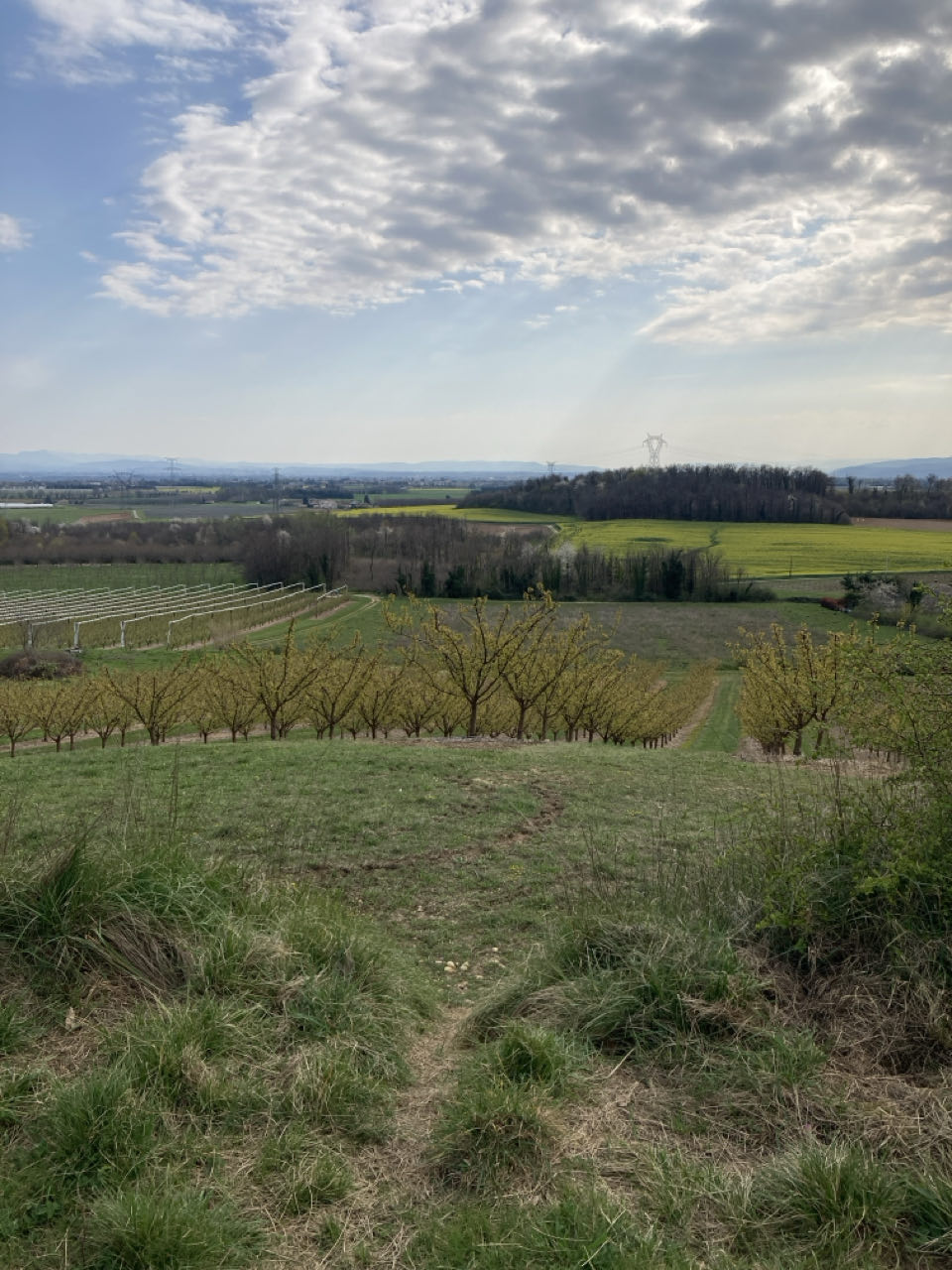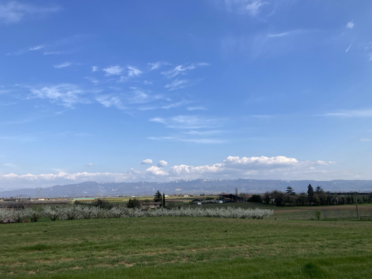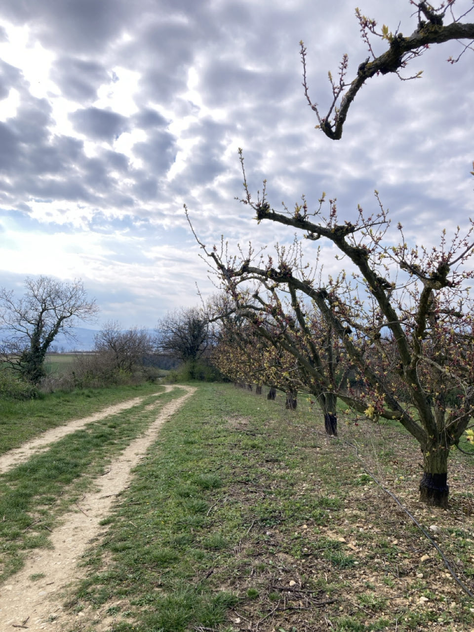 Après la floraison, les premières feuilles commencent à apparaître sur les arbres fruitiers (abricotiers, pêchers, kiwis, pommiers, etc). Le chemin reste sur les hauteurs et propose de beaux panoramas sur le Vercors enneigé. Puis, je quitte le balisage et me retrouve sur la butte des Baumes avec son circuit de VTT et ses rampes de lancement 🚀😂