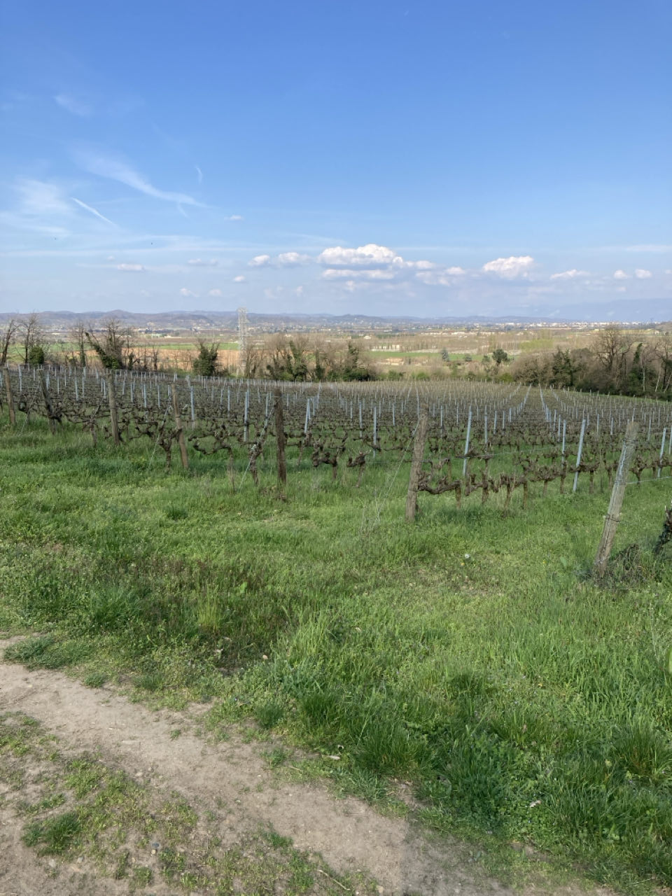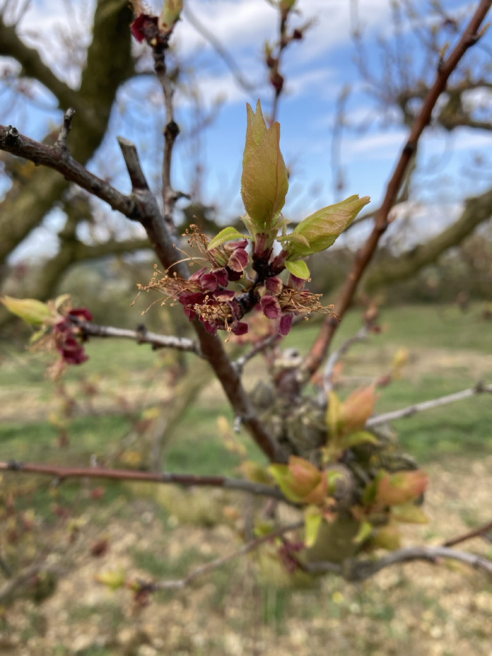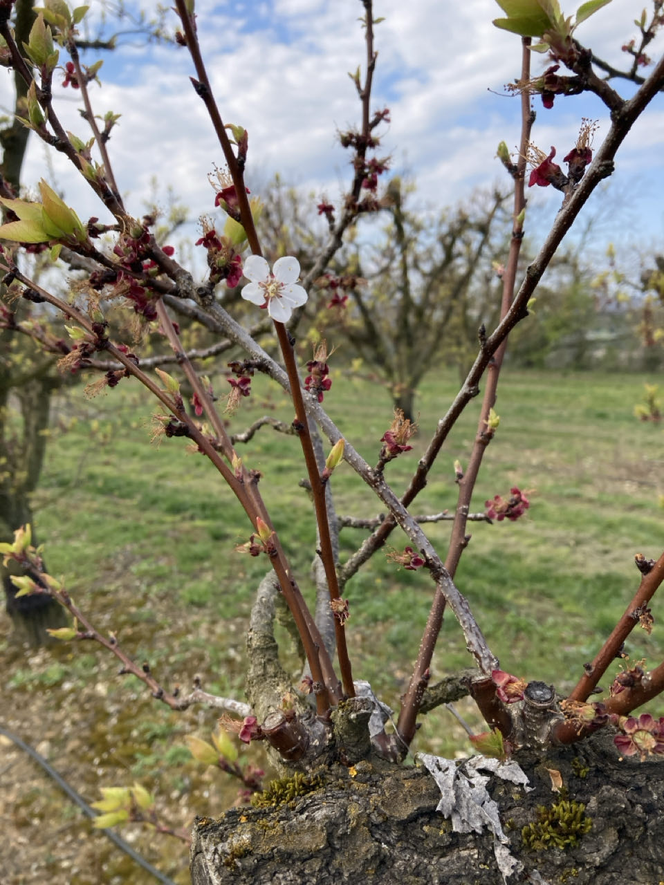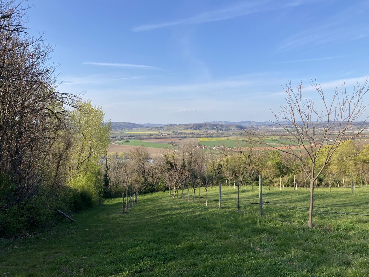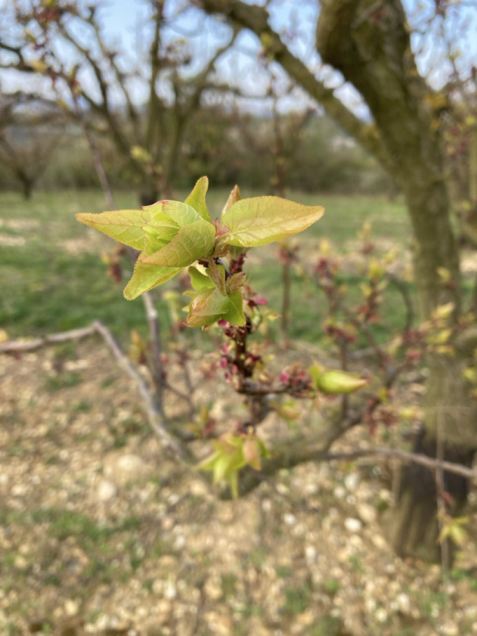 Après la floraison, les premières feuilles commencent à apparaître sur les arbres fruitiers (abricotiers, pêchers, kiwis, pommiers, etc). Le chemin reste sur les hauteurs et propose de beaux panoramas sur le Vercors enneigé. Puis, je quitte le balisage et me retrouve sur la butte des Baumes avec son circuit de VTT et ses rampes de lancement 🚀😂