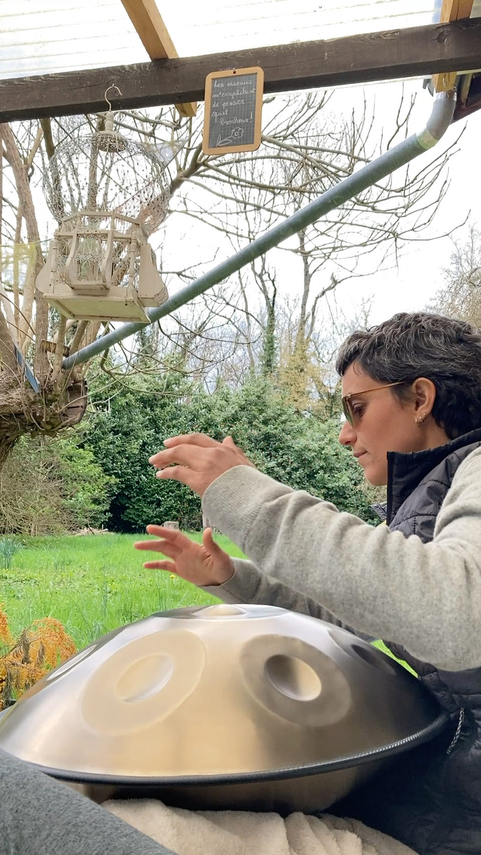 Je teste le handpan de Sylvie. C’est plaisant parce que même avec mon niveau zéro en musique et en faisant n’importe quoi, ce n’est jamais moche 😂 (vidéo à l’appui, voyez un peu la concentration !)