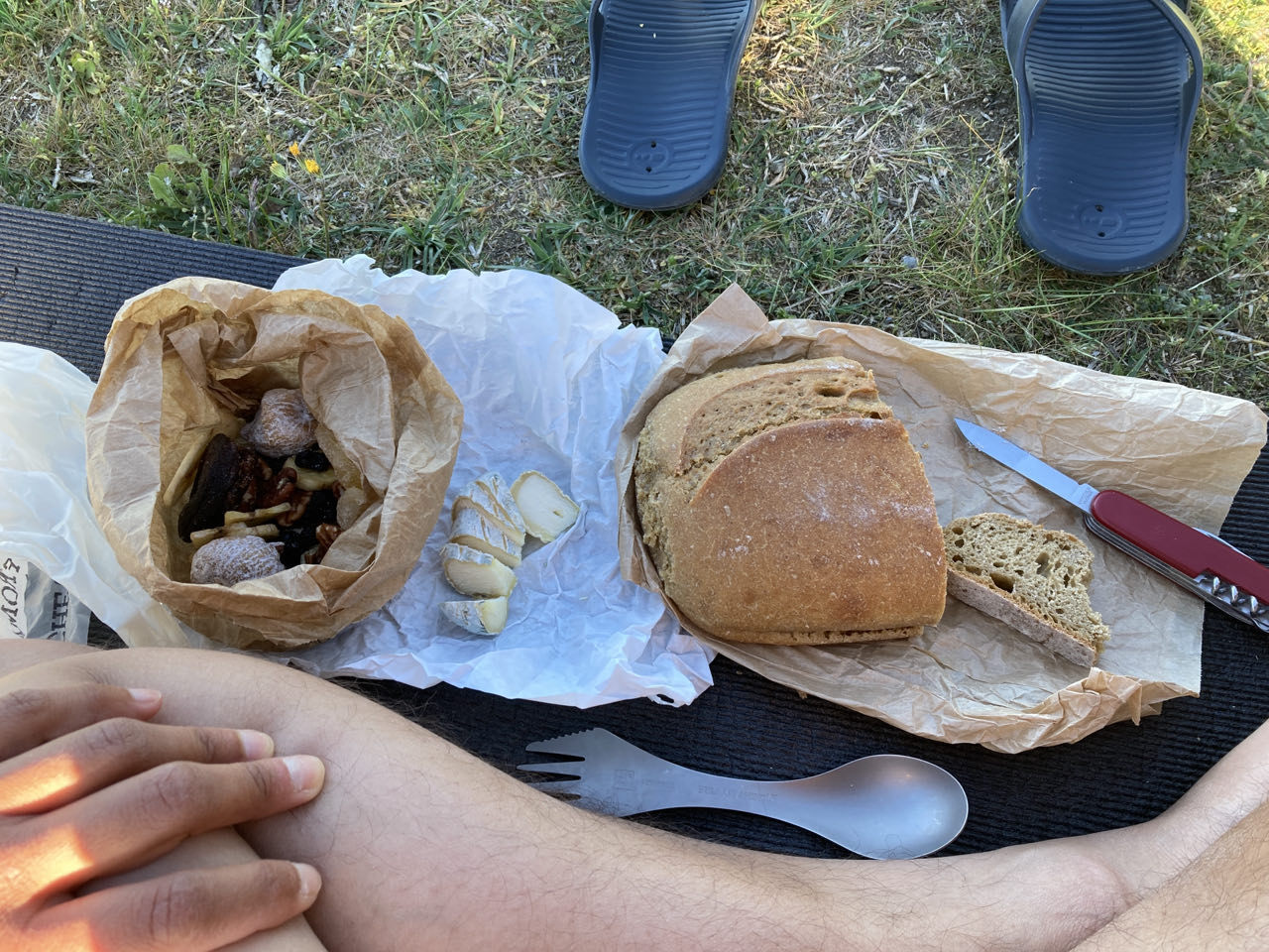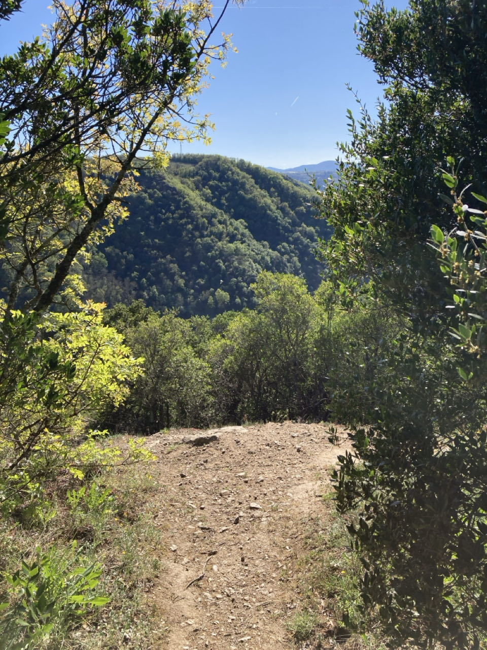 Je n’ai trouvé personne en sortant du village à qui demander un peu à manger et je n’ai plus grand chose. Du pain à l’épeautre, un demi picodon, des fruits secs. Heureusement, ce sont des bons produits du marché qui font plaisir, et je me régale de la vue.