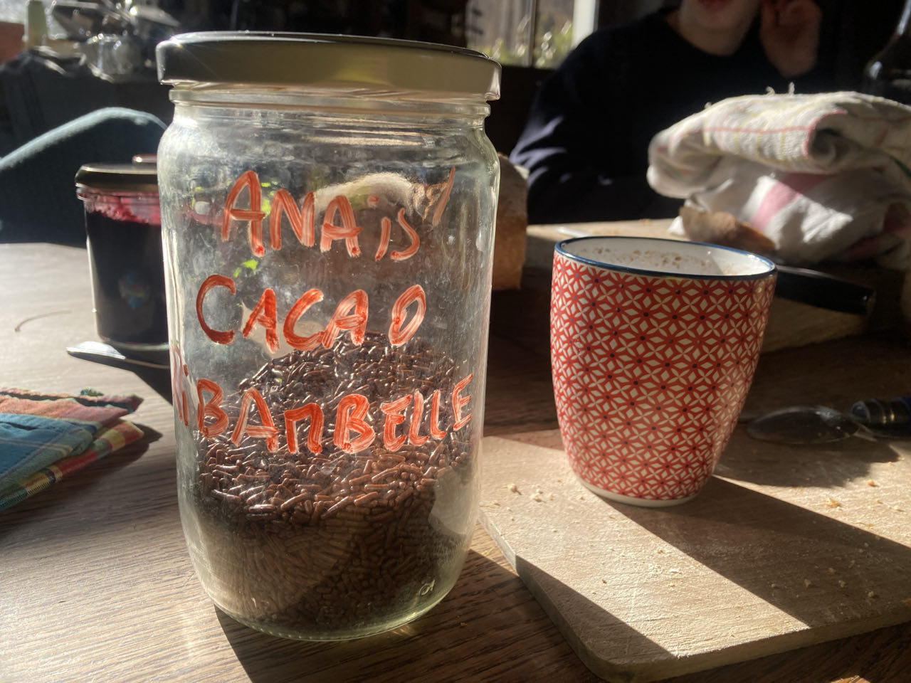 Merci Johanna et Gerard d’avoir partagé votre quotidien. Le chocolat est arrivé dans un bocal chez Anne-Laure et Guillaume, Solal, Zélig, Luna (voir 10.)