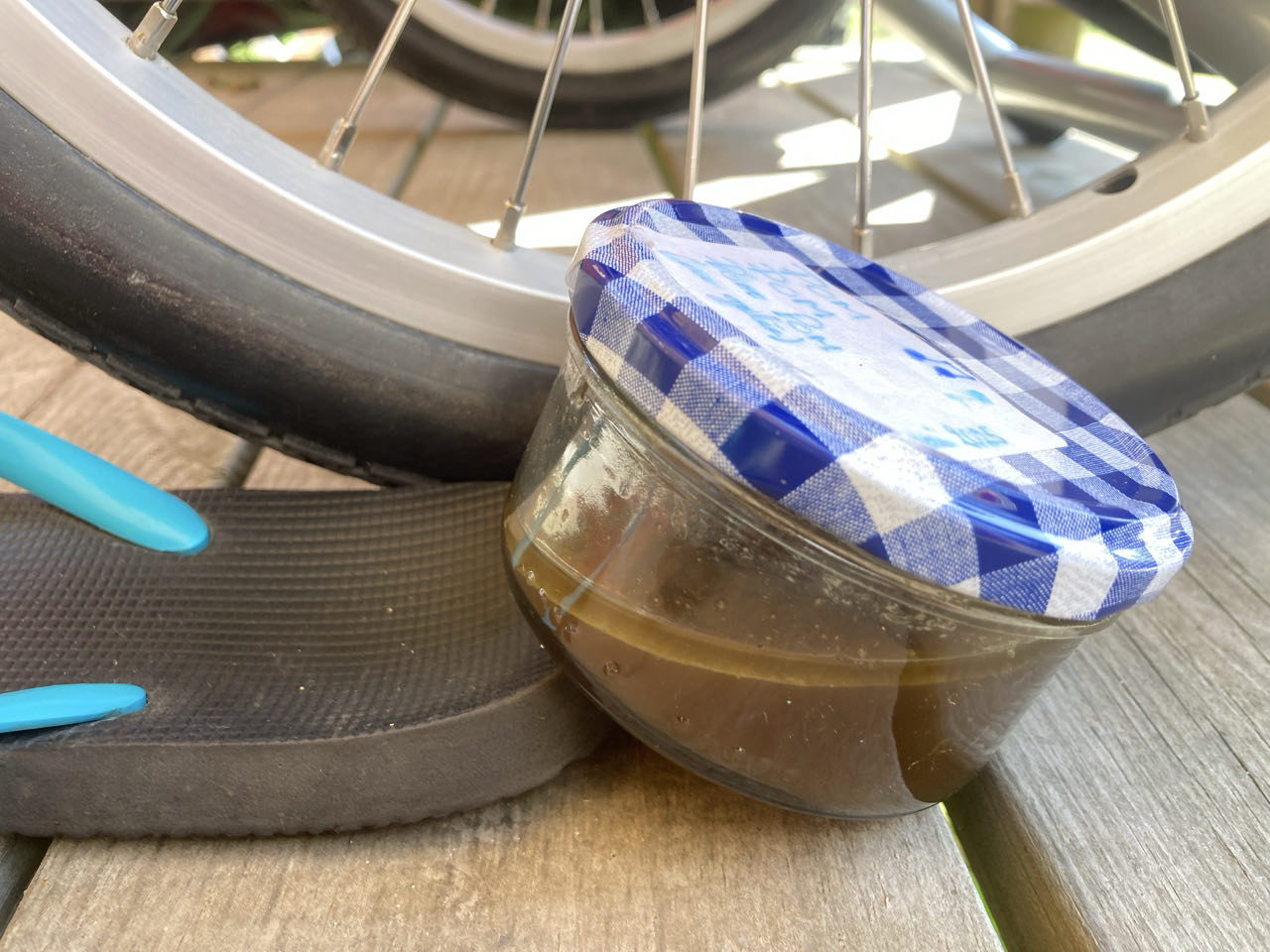 Je conserve l’huile dans un pot qui contenait de la gelée de pomme faite maison par Clarisse.