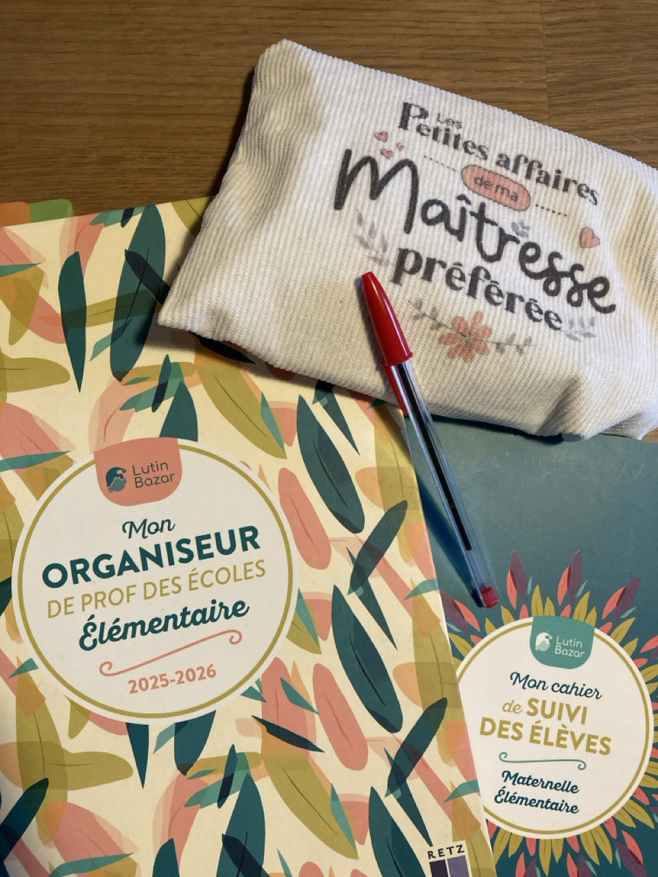 - un stylo rouge avec lequel elle corrige des devoirs, elle est institutrice !
