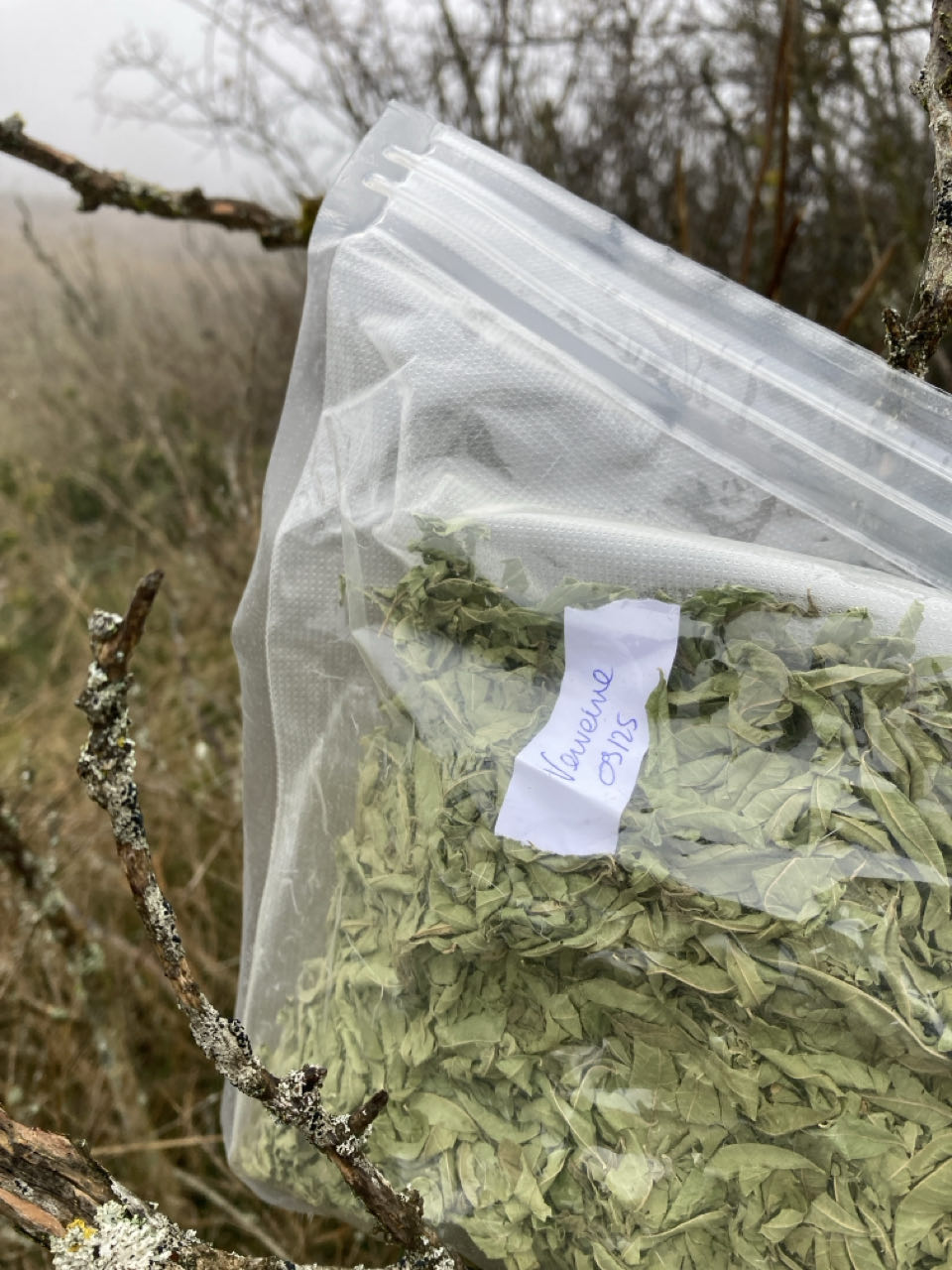 Je reçois deux objets : un sirop de menthe fait maison et des feuilles séchées de verveine citronnée. Claire me propose d’en garder un pour moi.