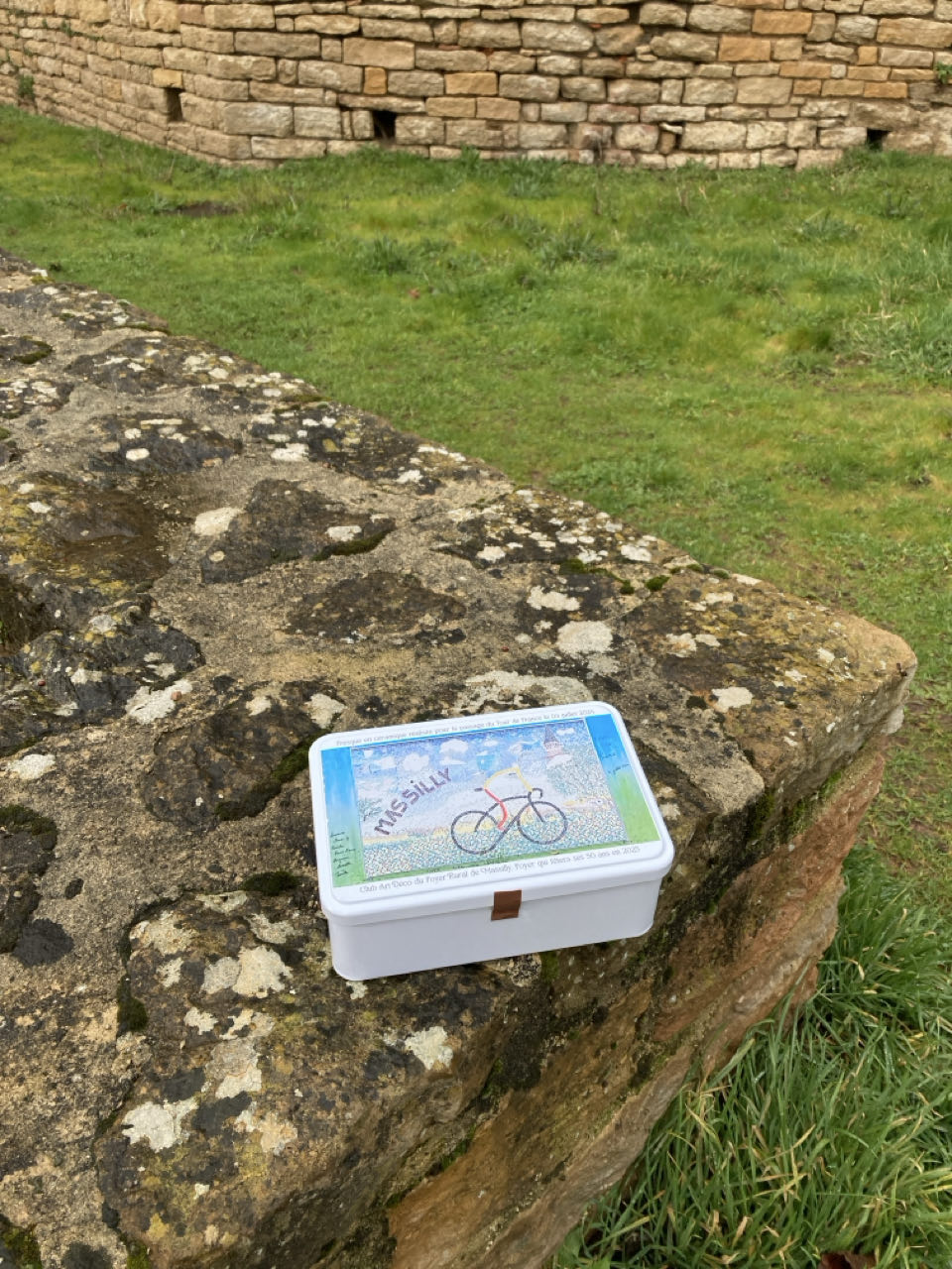 Le lendemain matin, il m’offre une boîte métallique fabriquée à l’usine de Massilly avec des gaufrettes de Bourgogne à l’intérieur fabriquée à Cluny. Le dessin a été réalisé par le Club art déco du Foyer rural de la commune.