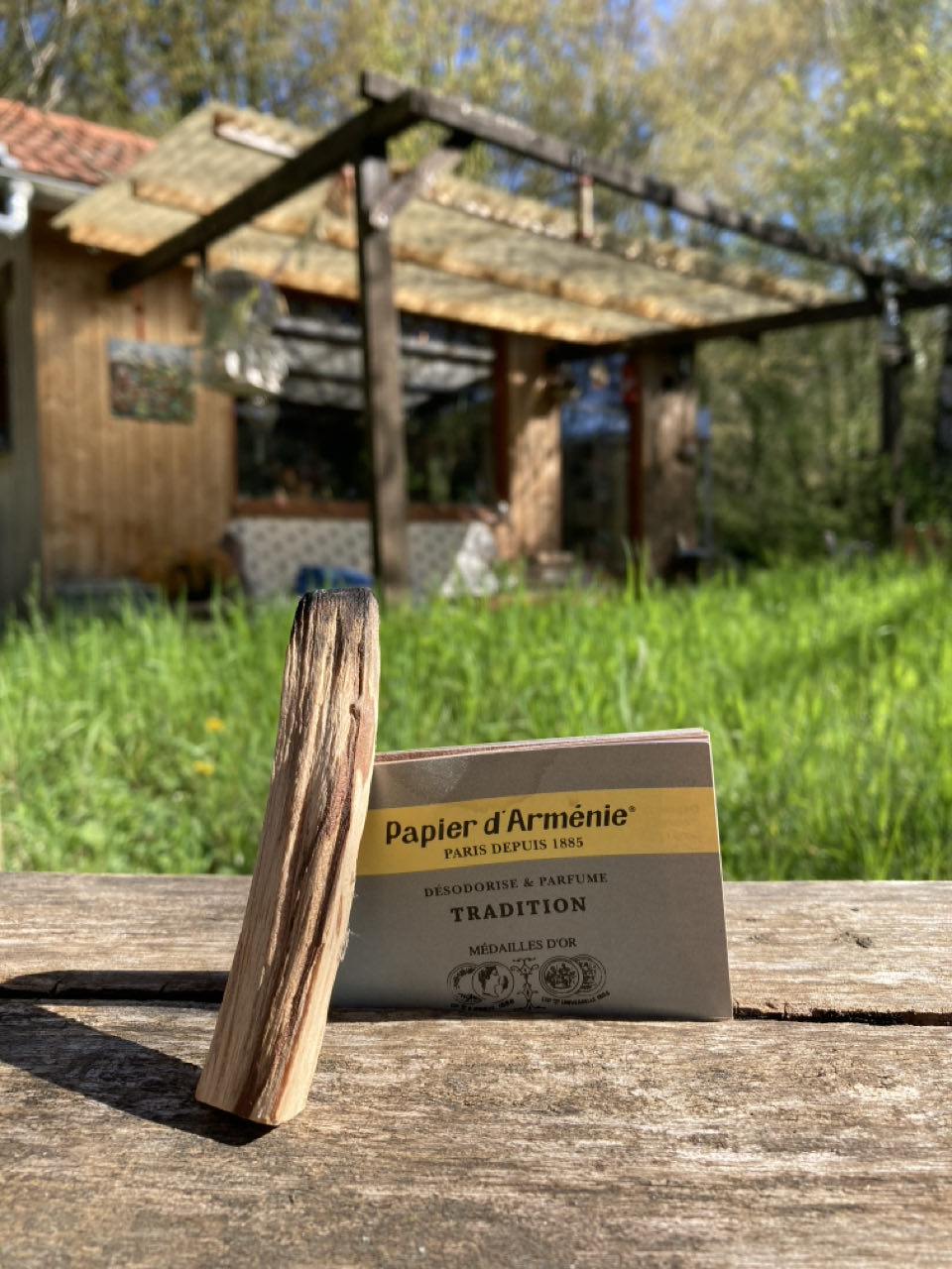 Avant de partir, elle me laisse un bâton de palosanto et du papier d’Arménie qui vont parfumer mon sac avant de les offrir !