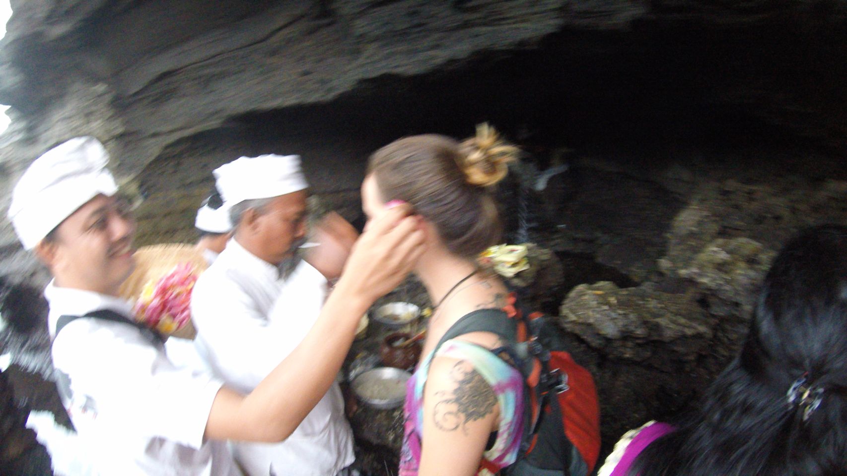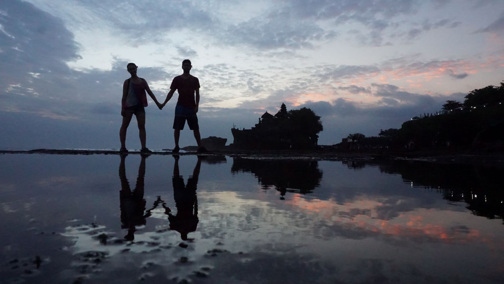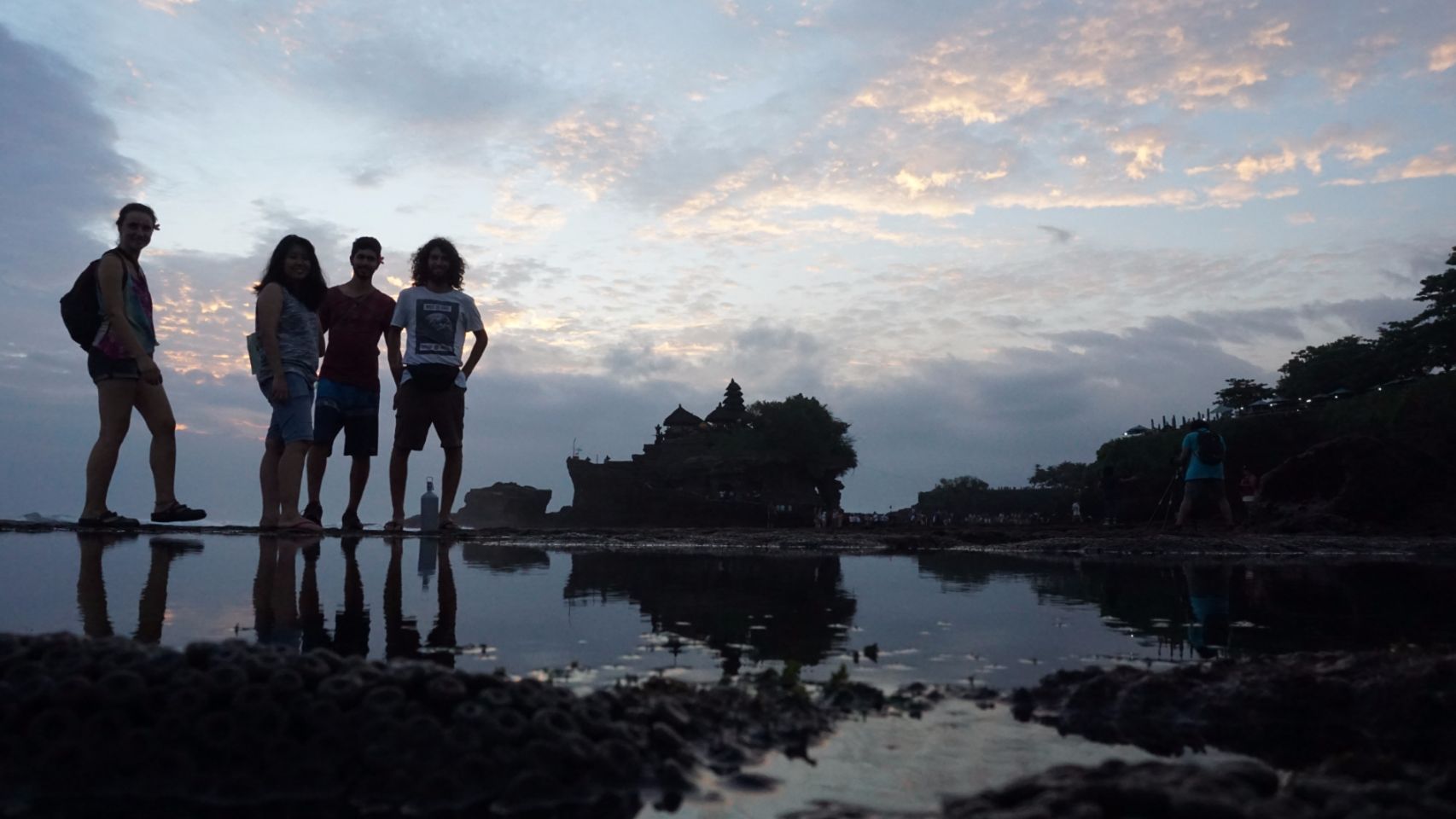 Visita ao templo de Tanah Lot, um dos mais populares por ser construído em um penhasco de rocha praticamente dentro do mar. Quando a maré enche não se consegue chegar até as escadas de acesso. Fizemos uma oração com a fonte sagrada para poder aproximarmos e tirar fotos.