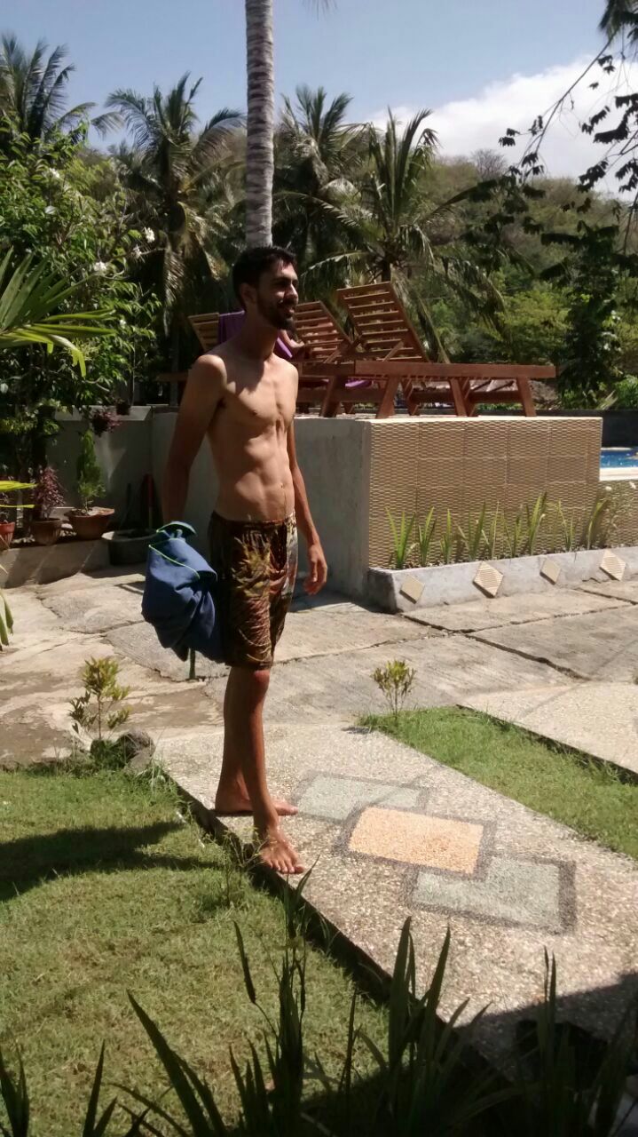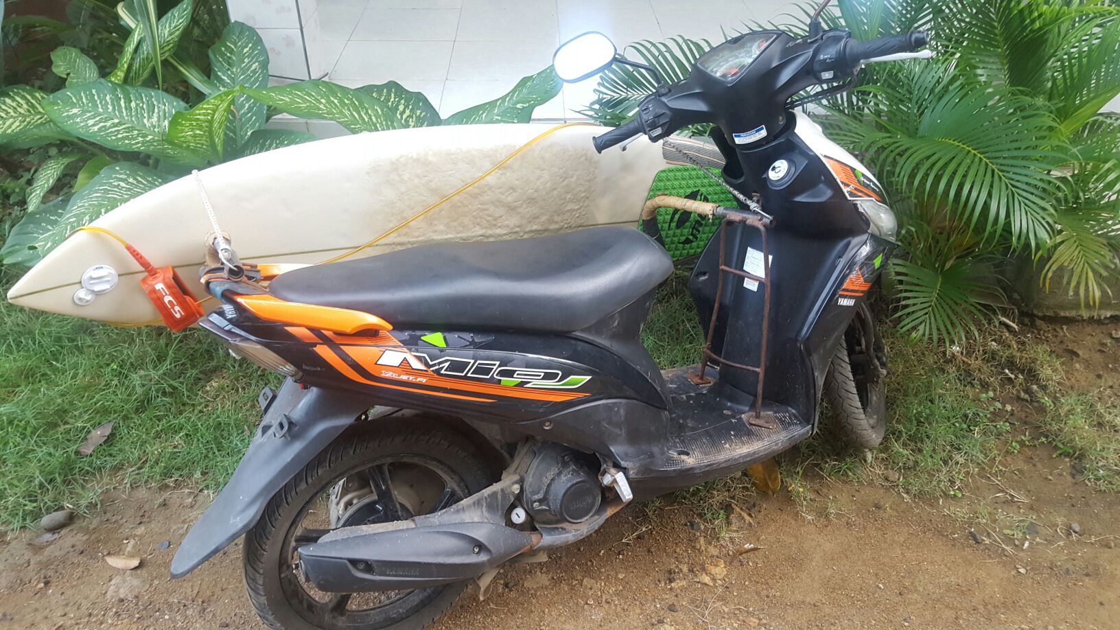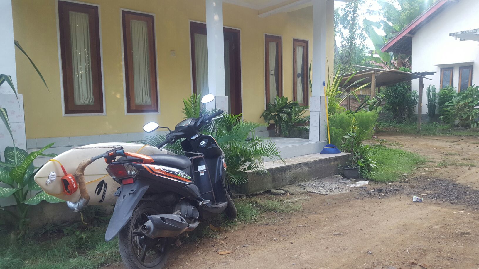 Nossa pousada, 50 mil rupias por pessoa com Café da manhã, cerca de 12 reais. A scooter sem registro, sem placa, sem velocímetro e marcador de combustível mas com rack pra prancha, 40 mil rupias por dia, 10 reais.