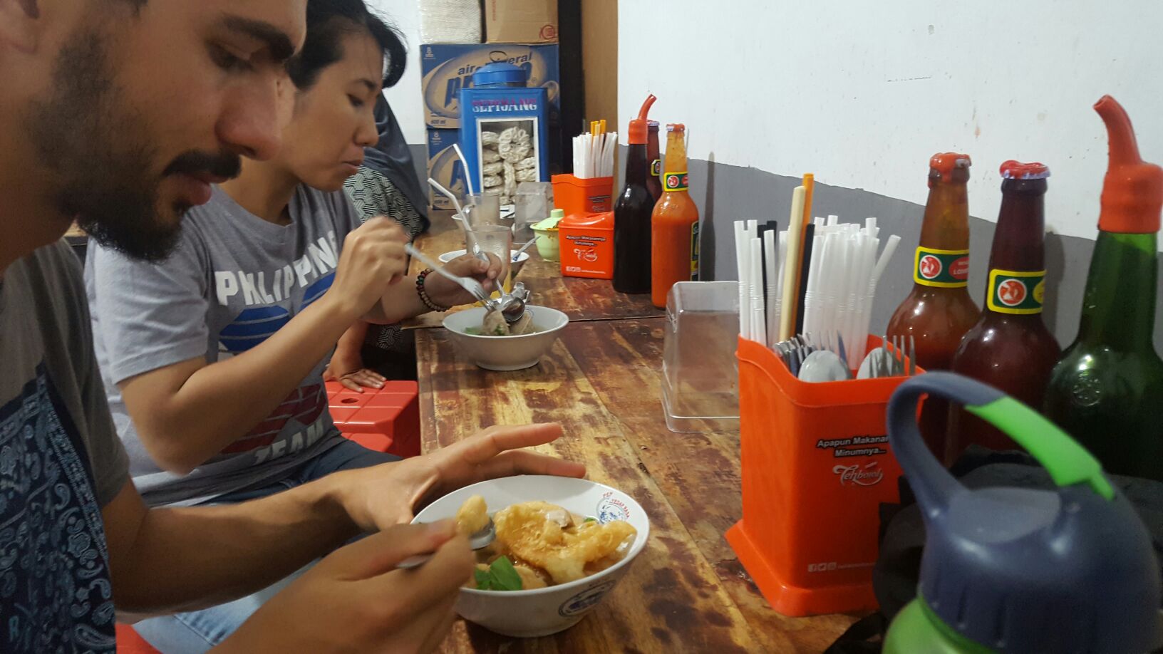 Experimentando Bakso, uma sopa com noodles e alm么ndegas tradicional, trocamos as alm么ndegas por tofu. Depois experimentamos terang bulan, uma panqueca grossa recheada com chocolate leite condensado banana amendoim e queijo 馃構