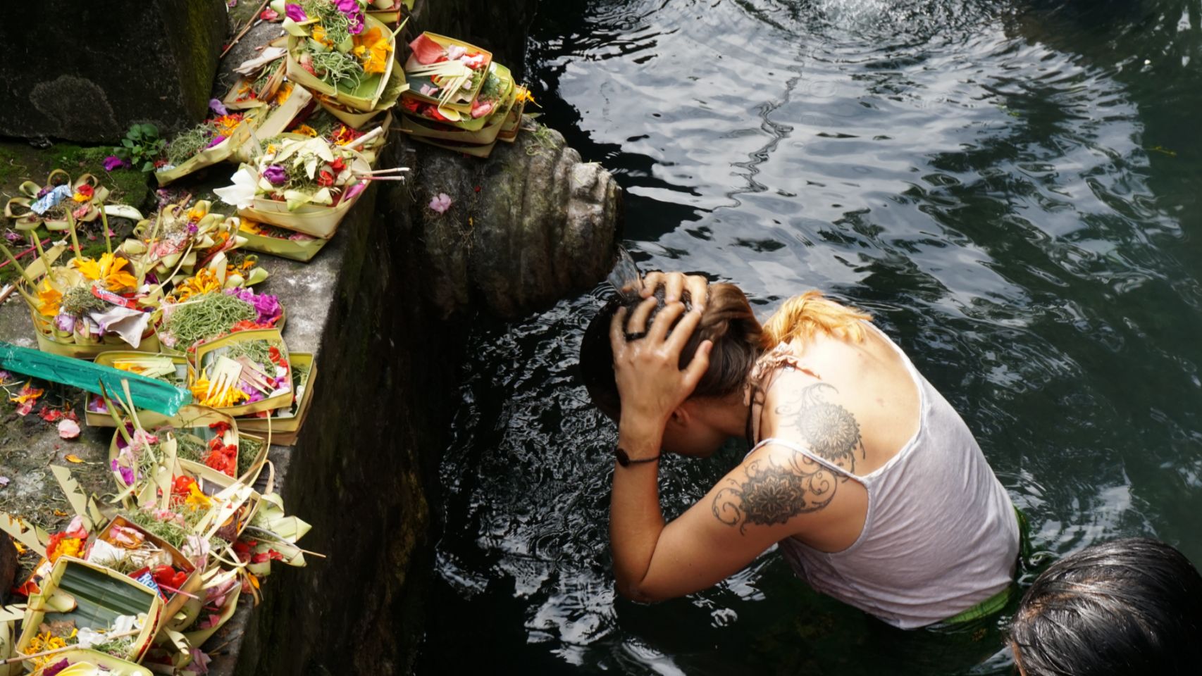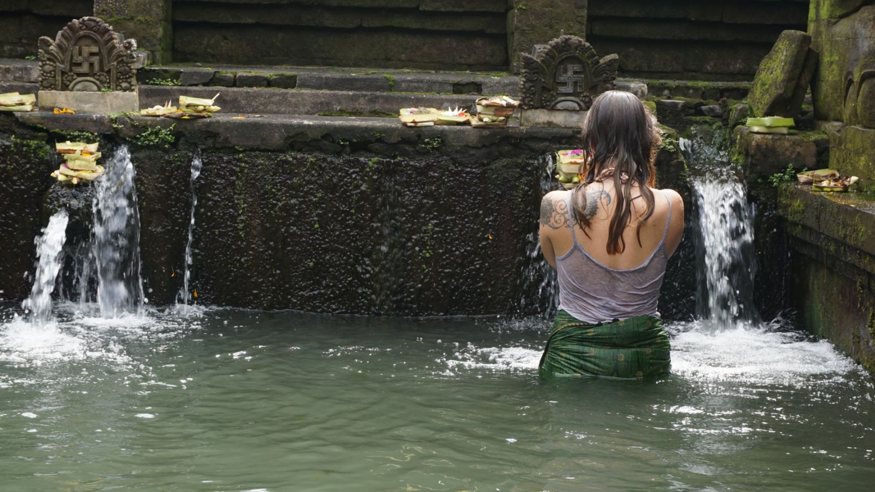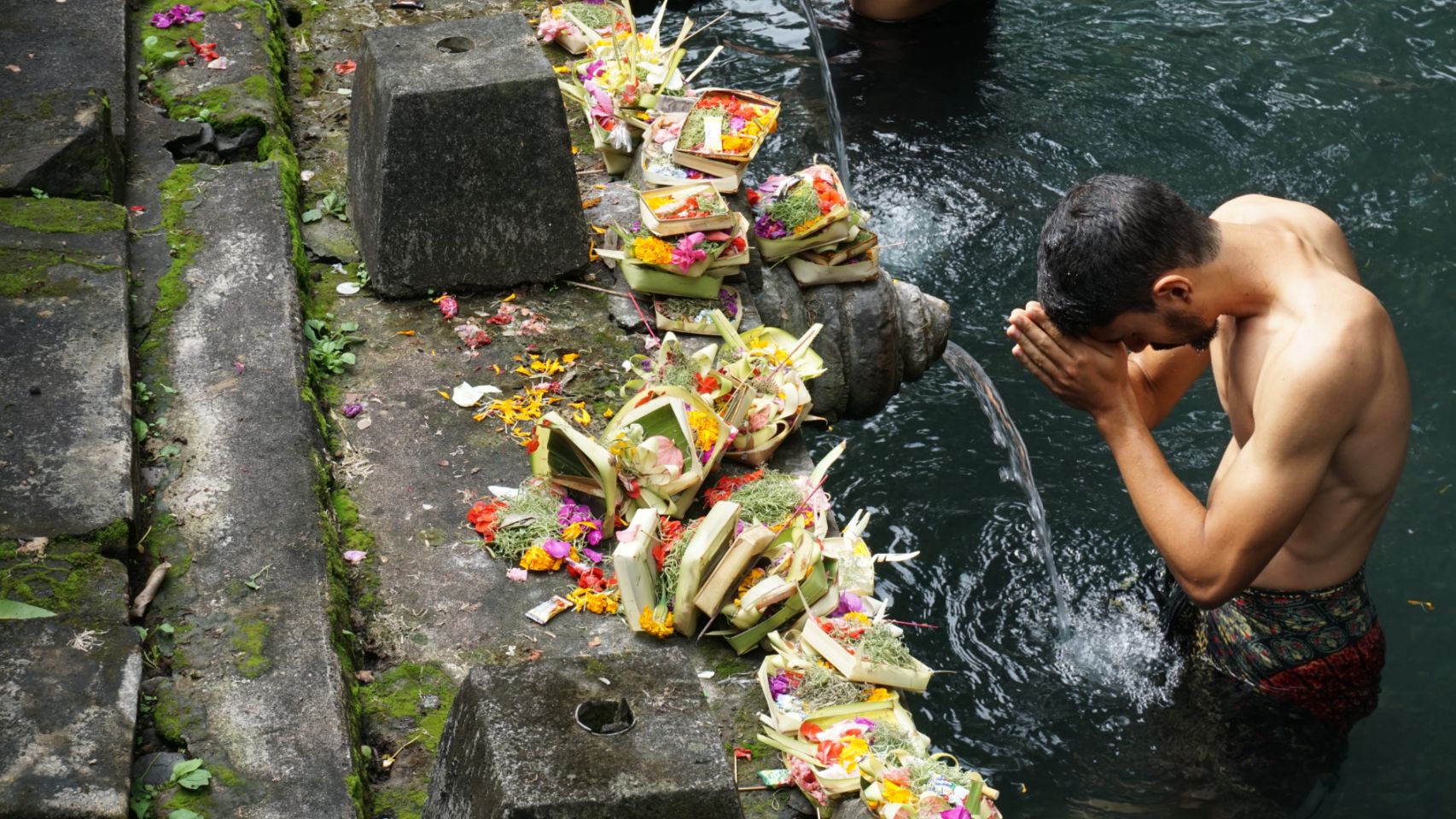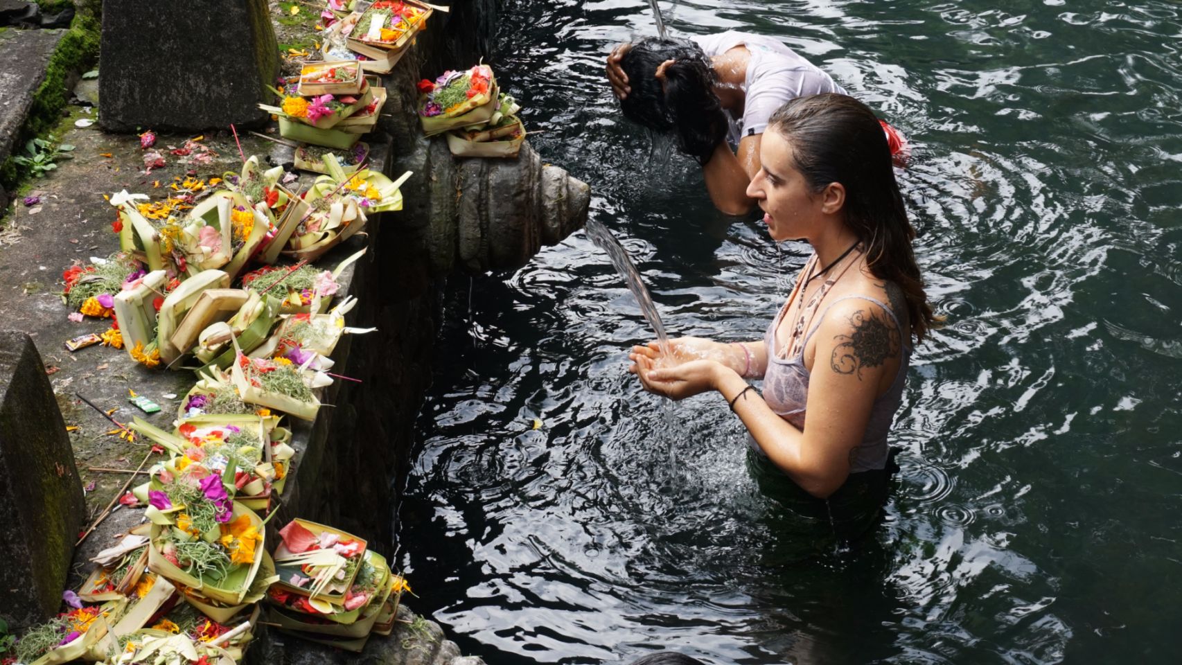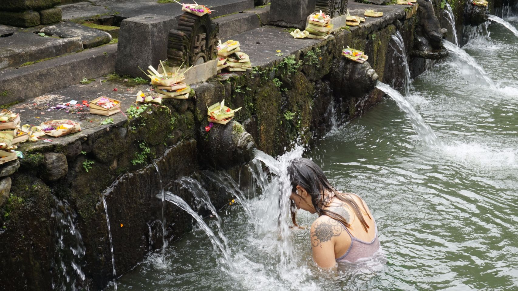 Visita ao templo das águas sagradas. Destaque para o ritual de meditação e reza. Vestindo Sarong e camiseta fizemos uma oferenda para os deuses do templo com insenso, flores e arroz, através da meditação pedimos licença e agradecemos pela oportunidade de estarmos lá. Concentramos em um pedido e em seguida começamos um ritual em que soamos o ohm 3 vezes, lavamos nossa boca 3 vezes, tomamos 3 goles e lavamos a cabeça 3 vezes com a água que sai dos monumentos do templo. Repetimos isso para cada monumento, cerca de 15. Esse ritual representa a renovação e purificação da mente, corpo e espírito. Nos sentimos muito honrados em poder praticá-lo e saímos literalmente de alma lavada da experiência.