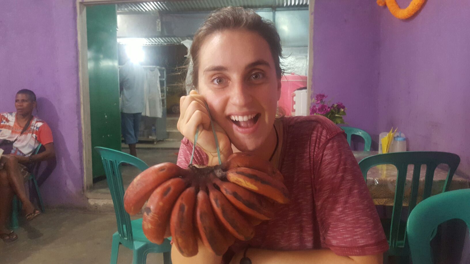 Ajudando a Andrea a organizar os produtos dela. Comprando bananas gordas e rosa, e parando pra pegar nossa janta (martabak:o pastel frito dos indonesianos) no restaurantes dos indianos 😊