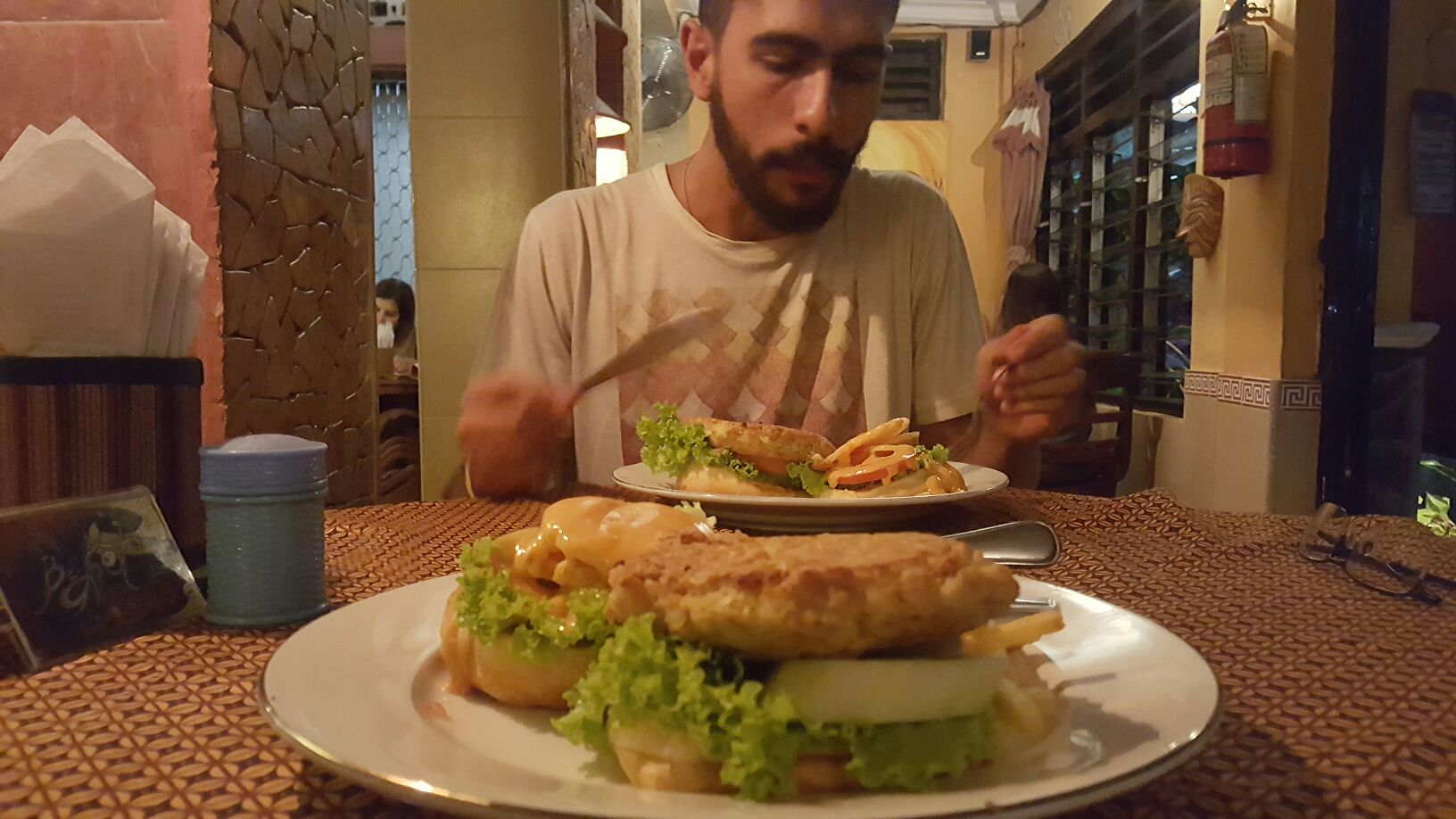 Tempe burger e fried banana ice cream.