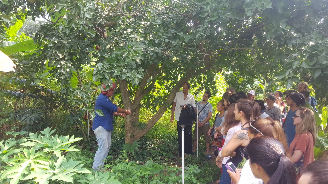 Tour na Solitude farm. Krishna vive em Auroville há mais de 20 anos. Ele é super entusiasta com relação a Permacultura e alimentação baseada em plantas locais ou que crescem bem no clima local. Pra ele não faz sentido o esforço e energia empregados para transporta comida de tai longe que do existe uma variedade gigante de plantas que podemos utilizar e que crescem facilmente com as condições locais. Ele descreve que é possível utilizar das mais diversas formas o mamão verde, o tronco do mamão, o tronco da banana, folhas de várias árvores frutíferas, folhas de plantas consideradas weeds, raízes e sementes de plantas que não encontramos nos mercados por não serem popular como brócolis, cenoura e couve flor.