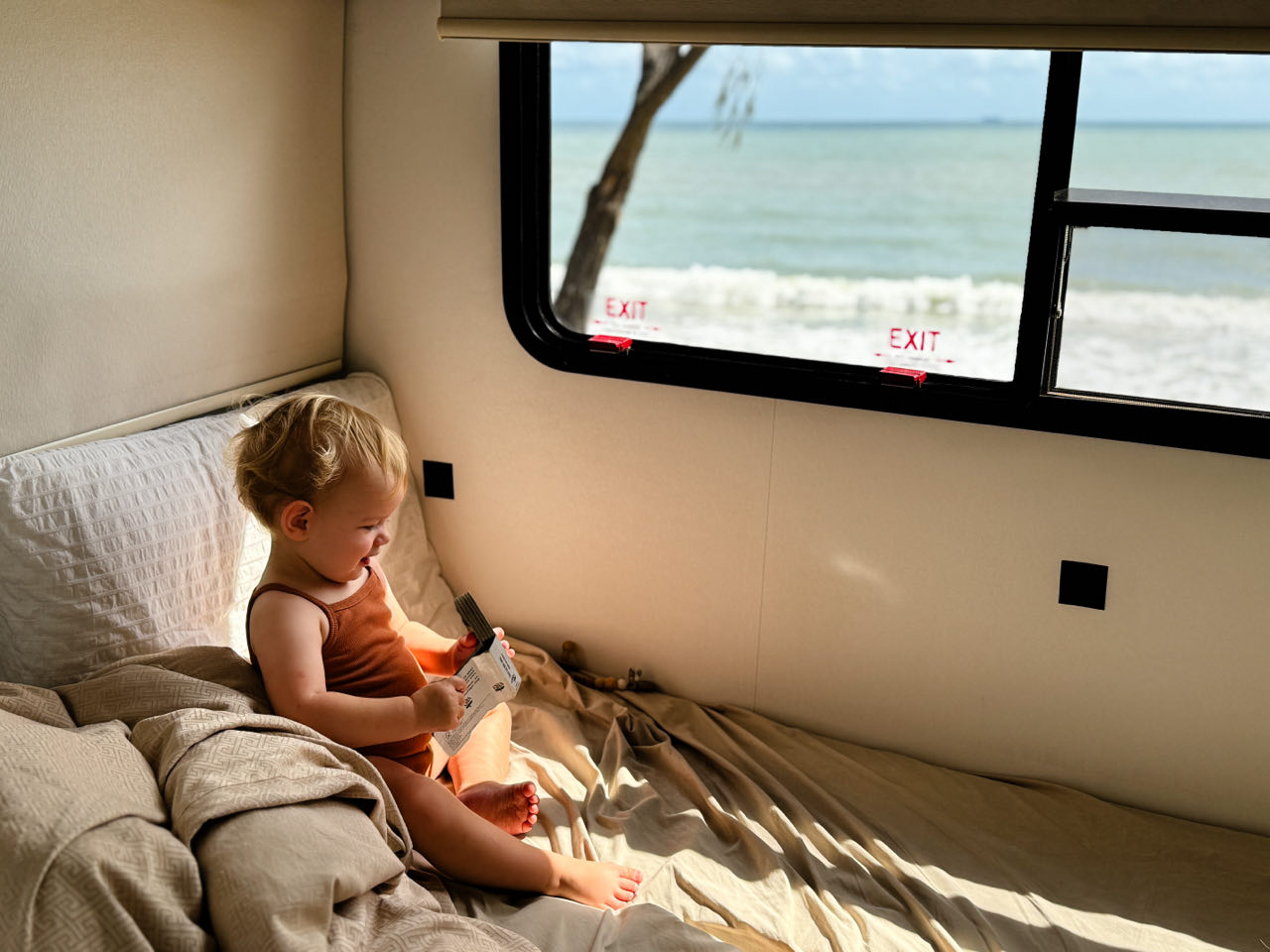 En wat een feest de eerste camping, direct aan de oceaan. Dan smaakt je eerste bakje koffie van de dag écht een stuk lekkerder.