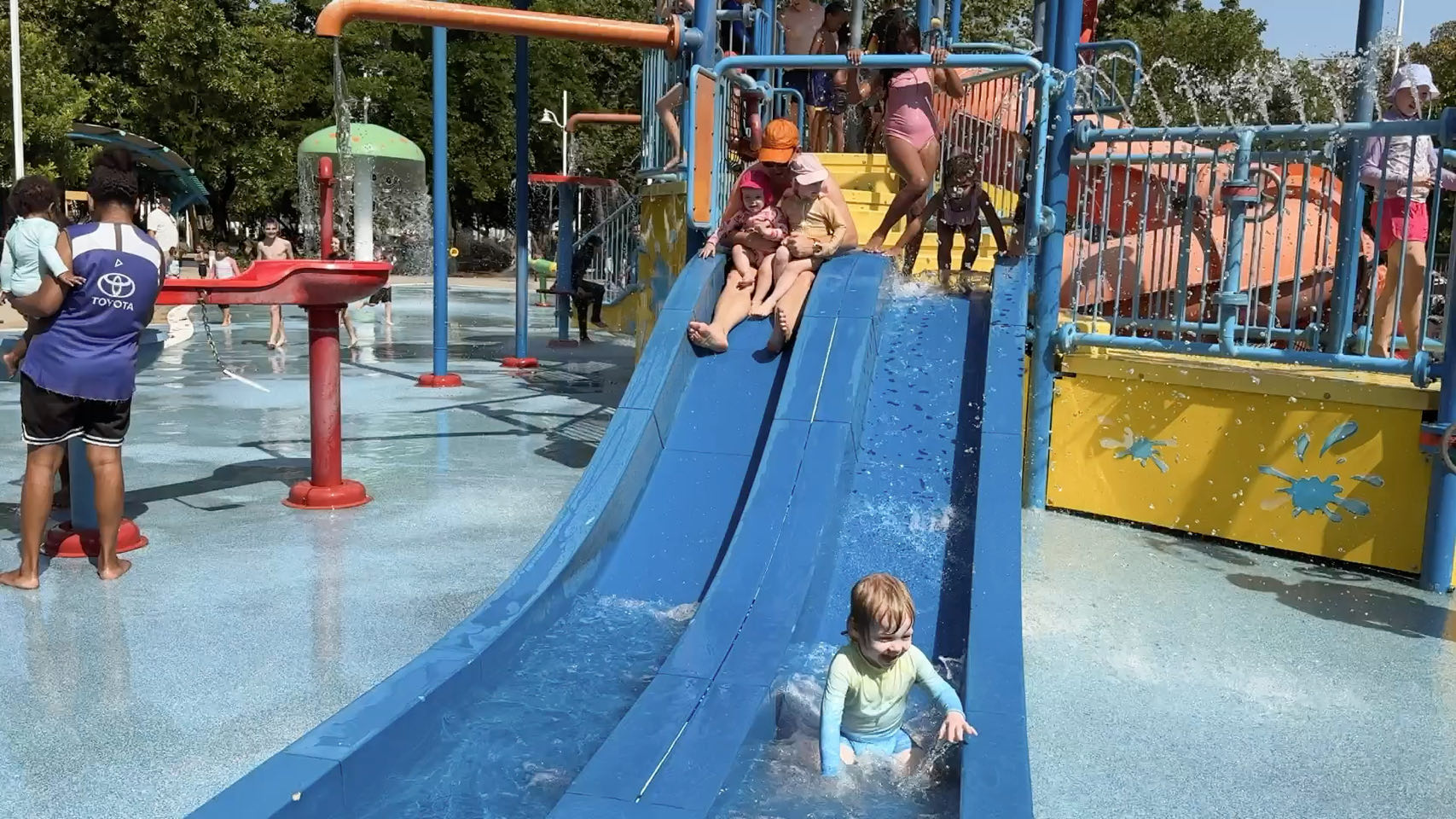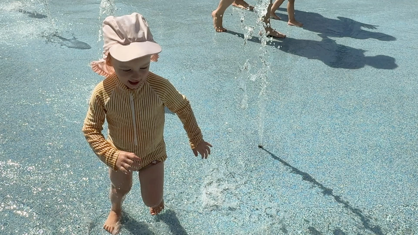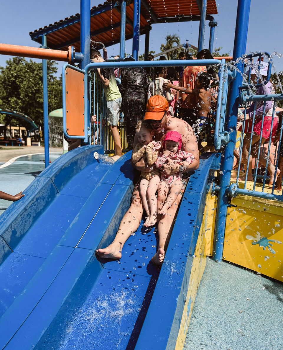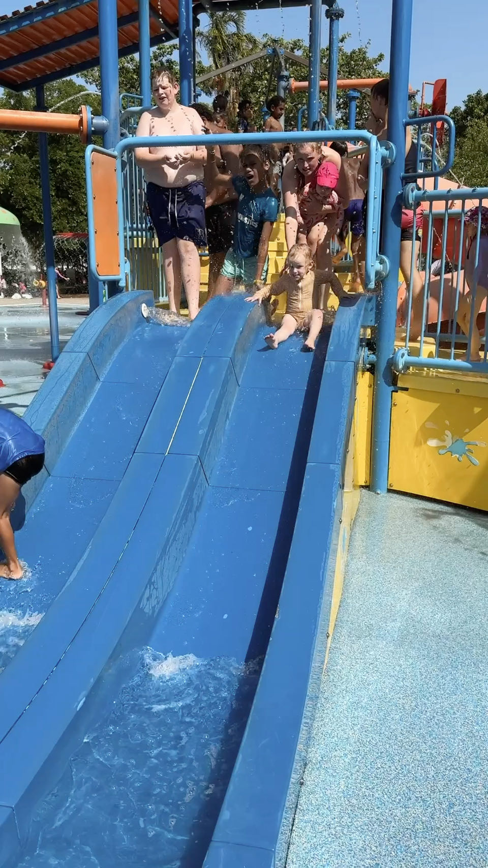 De meiden konden hun lol niet op met alle fonteinen, spuiten en glijbanen, waar ook paps en mams perse van afmoesten.