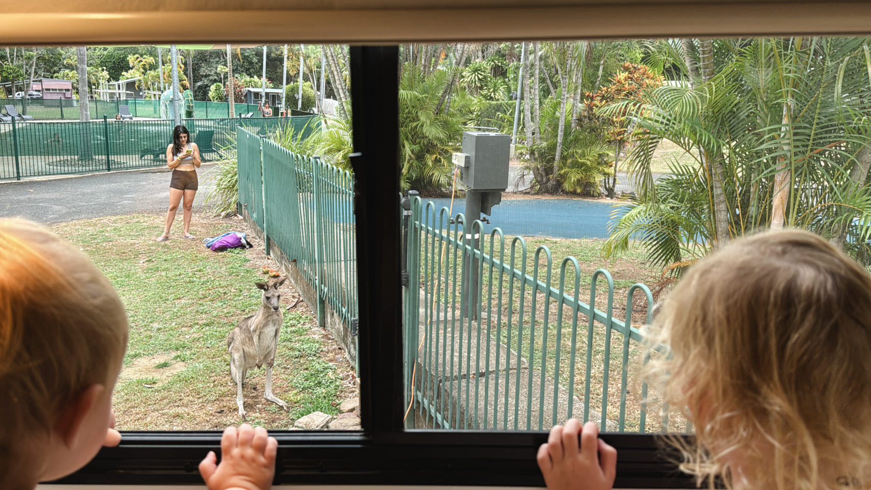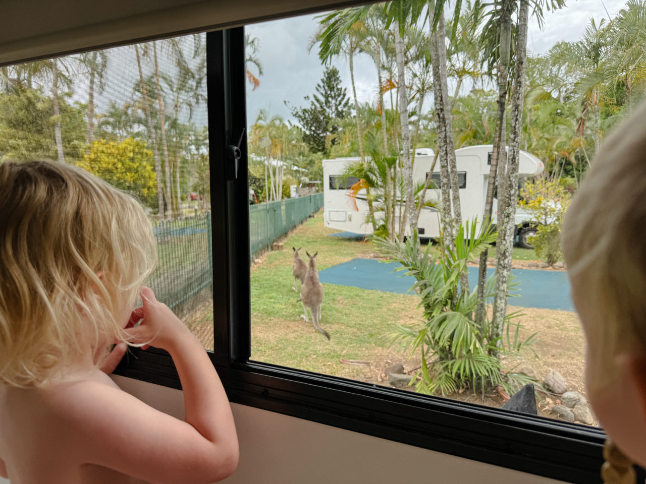 We besluiten om de volgende dag al door te gaan, ipv de twee nachten vol te maken. Dat besluiten we pas nadat we wakker worden dus die vroege kangaroes op het strand hebben we gemist. En zij ons. Daarom kwamen ze maar even wat rond de camper jumpen tegen de tijd dat de Poelens uitgeslapen waren :-)