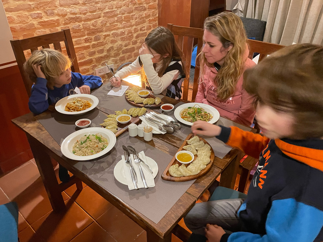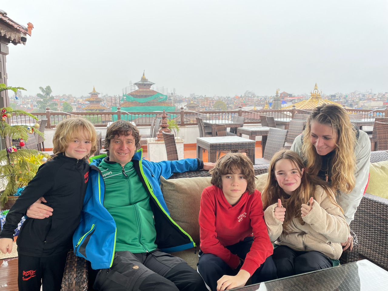 Eerste lunch op dakterras bij heerlijke boutique hotel Pahan Chhen in Patan. Daarna even op de thee bij de familie Shrestha en na het diner op de kamer en een potje yahtzee op tijd naar bed.