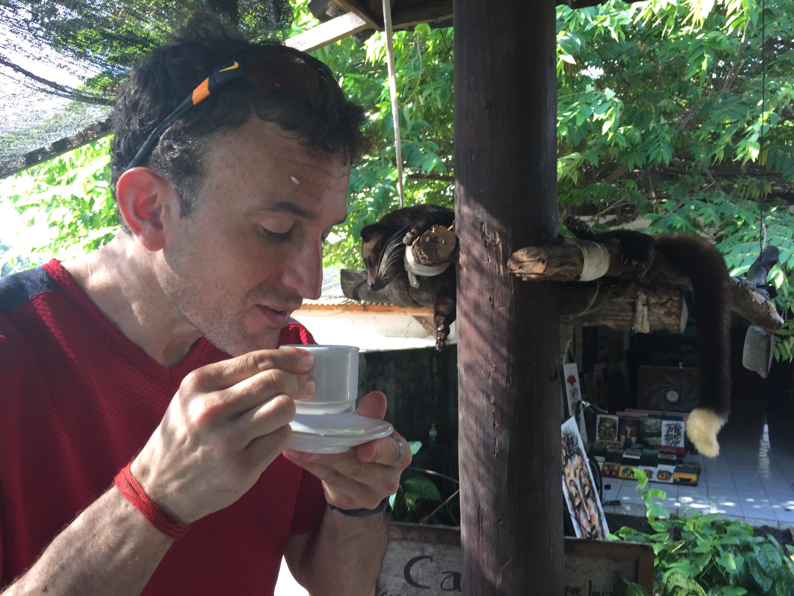 Drinking Luwak coffee (yes, the one that went through the digestive system of the Luwak, coincidently the one posing for the picture behind me)