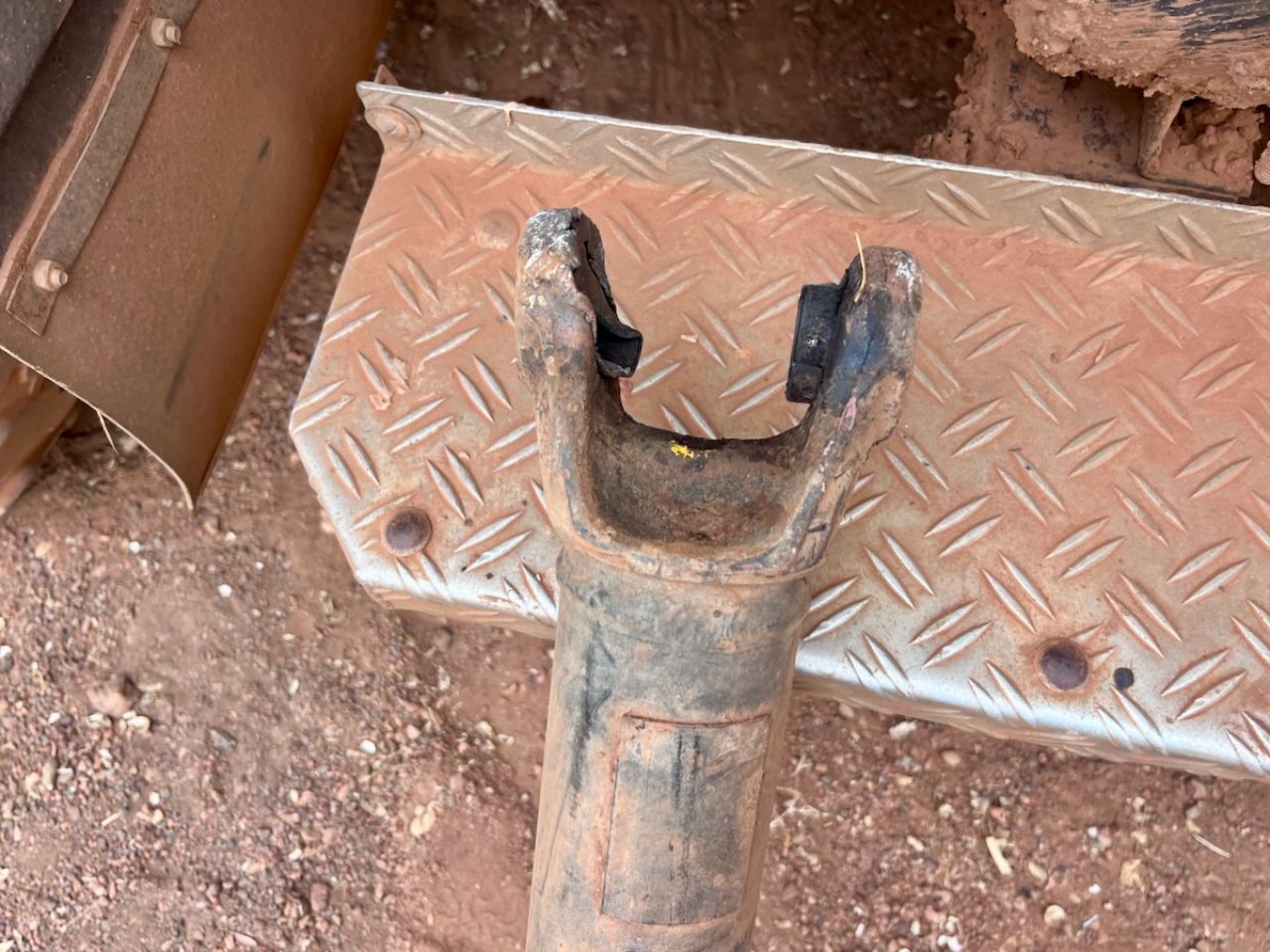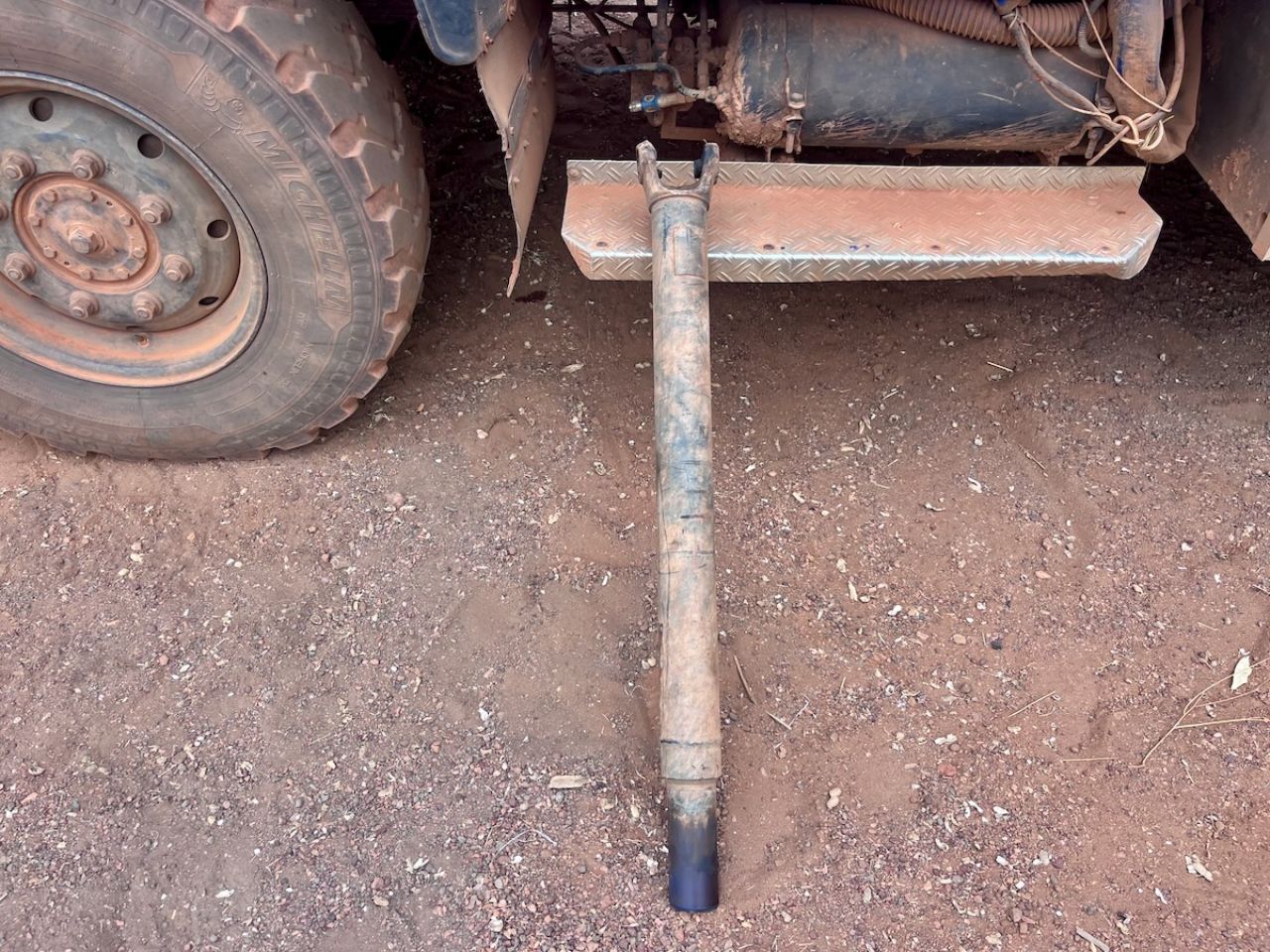 Ligne droite... Crac boum hue, énorme bruit de métal en colère, Cargol qui se trémousse... Un problème de roue ? Arrêt d'urgence ! Et là dans le fossé, quelques mètres en amont, gît lamentablement les 3/4 de l'arbre de transmission ! Mais kétufoulà ! Bilan des courses : le croisillon de l'arbre avant a fondu, détachant la partie avant du différentiel. En fait le bruit que l'on entendait au ralenti devait venir de là ... le p'tit graisseur métallique tout rikiki est absent. Dans sa chute, il a dû se loger dans le croisillon qui tournant à toute vitesse à fondu le métal. Maudit soit le Dieu Croisillon. L'autre bout de l'arbre pendouille, toujours accroché à sa boite de transfert. Impossible à déboulonner. Reste à sangler façon Mac Gyver ce bout pendouillant. Un peu de pitié pour nos tympans, éviter le bruit ravageur de ce moignon métallique qui vient taper les entrailles de Cargol.