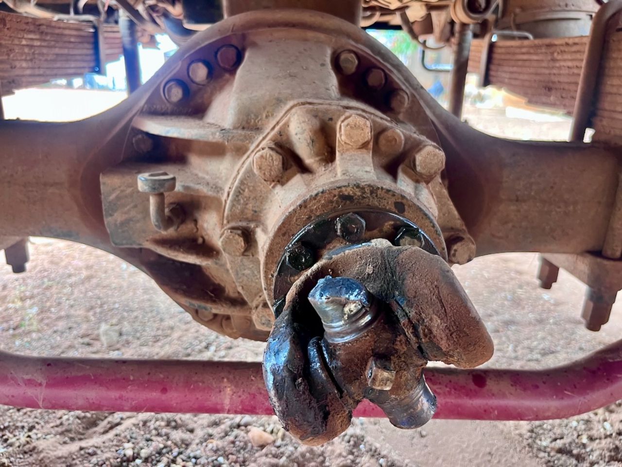 Act Two — Cargol vs the Driveshaft: a sudden CRACK, metal fury, emergency stop. Half the front driveshaft lies dead in the ditch — victim of a melted joint and divine mechanical irony. Quick fix à la MacGyver: strap the dangling piece tight and pray for silence.
