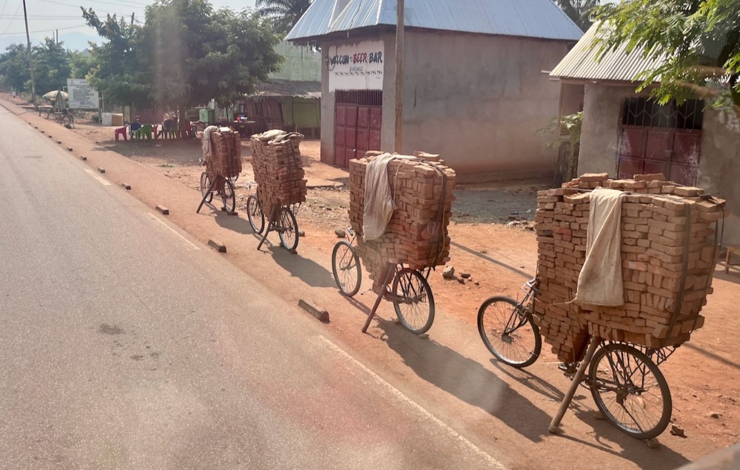 Stations services en berne...Toujours cette sensation de survie dans les villages traversés... Combien de briques seriez-vous capable de porter sur un vélo ? Ils en portent à vue d'oeil plus d'une centaine, y'a plus qu'à pousser. Si seulement il y avait une discipline olympique...