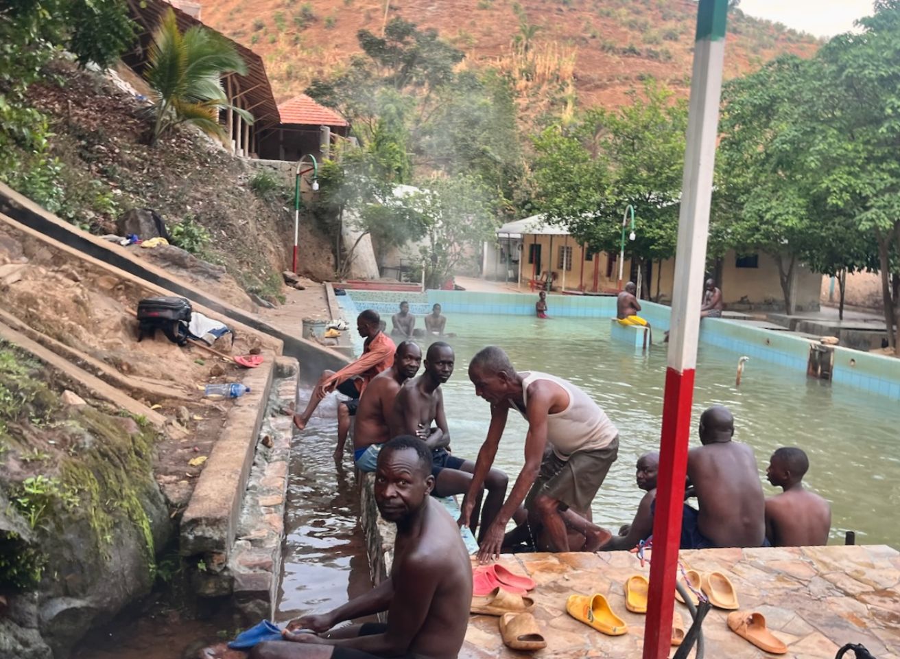 Besoin de se ressourcer. Direction des sources chaudes. La route ? Un champ de cratères, moyenne 20 km/h. Détour obligatoire, la piste principale prévue s'avère plus une balade de mobylettes qu’une route. Le Burundi est plein de surprises scabreuses. Arrivée au bain : une grande piscine à l’africaine, vapeur comprise. L’eau frôle la cuisson lente, on n’a pas la peau de black pour cela. Heureusement, un petit filet tiède à 35° entre les roches permet de barboter sans finir à point.